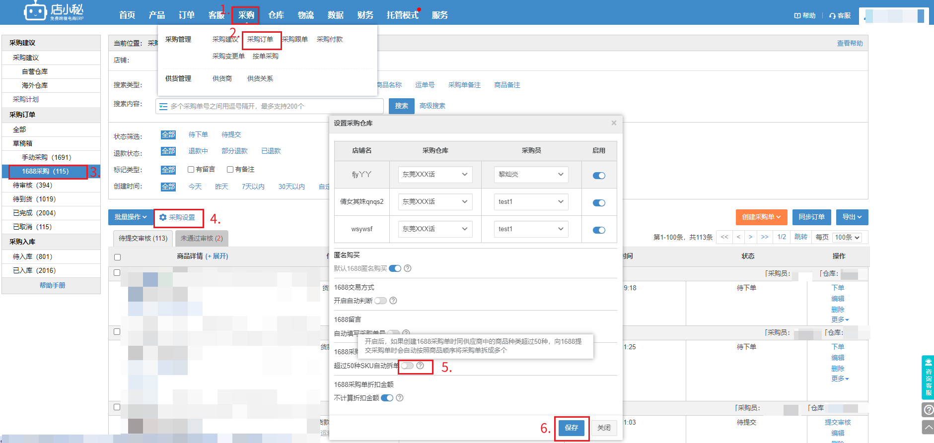 开启后,如果创建1688采购单时同供应商中的商品种类超过50种,向1688提交采购单时会自动按照商品顺序将采购单拆成多个!