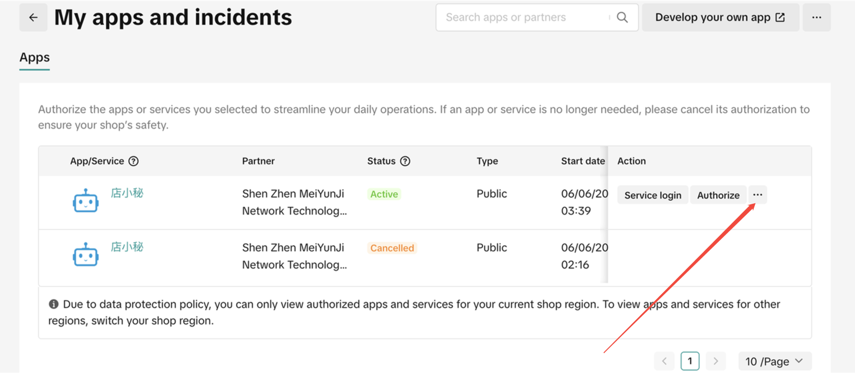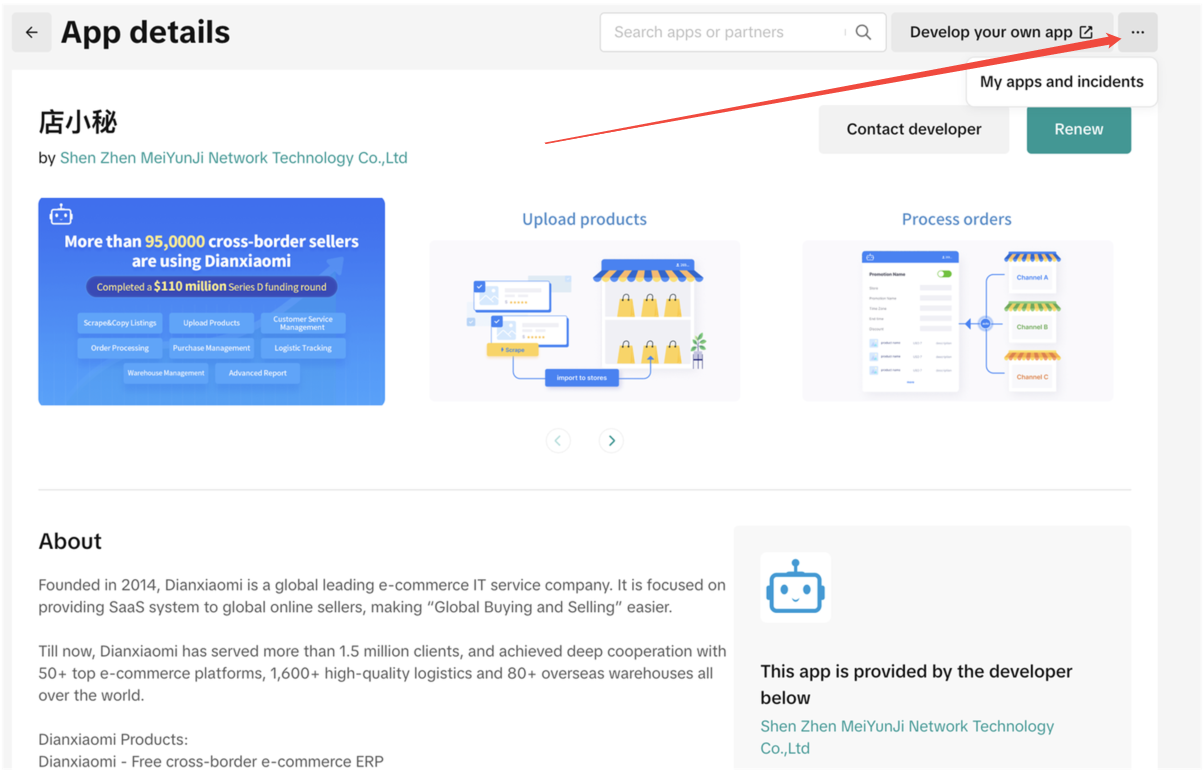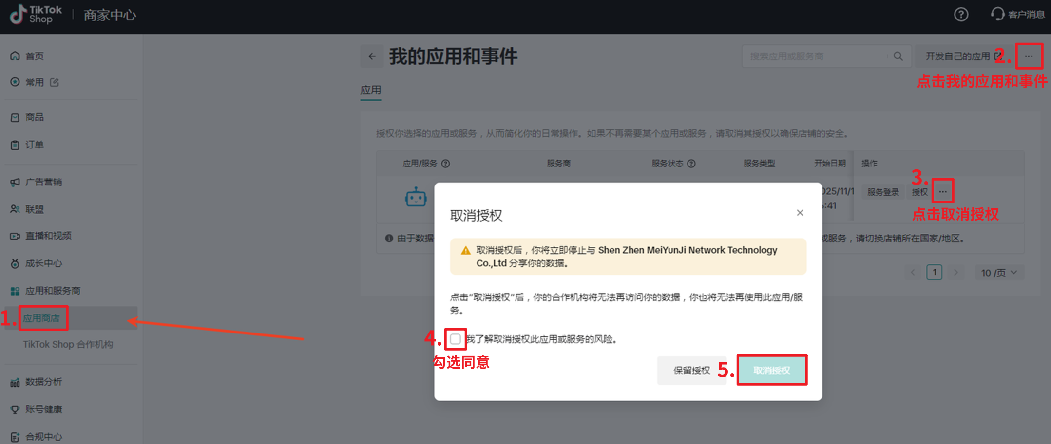 取消步骤:Tiktok后台应用市场找到店小秘打开后,右上角三个小点进去,然后在点击三个小点有取消按钮