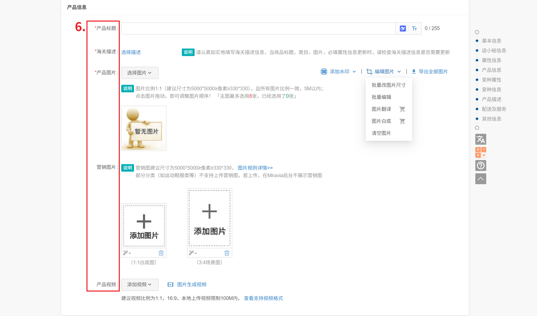 ⑤ 产品视频:1、建议视频比例为1:1,16:9,本地上传视频限制100M内,格式为:mp4,具体流程可参考:Miravia上传视频