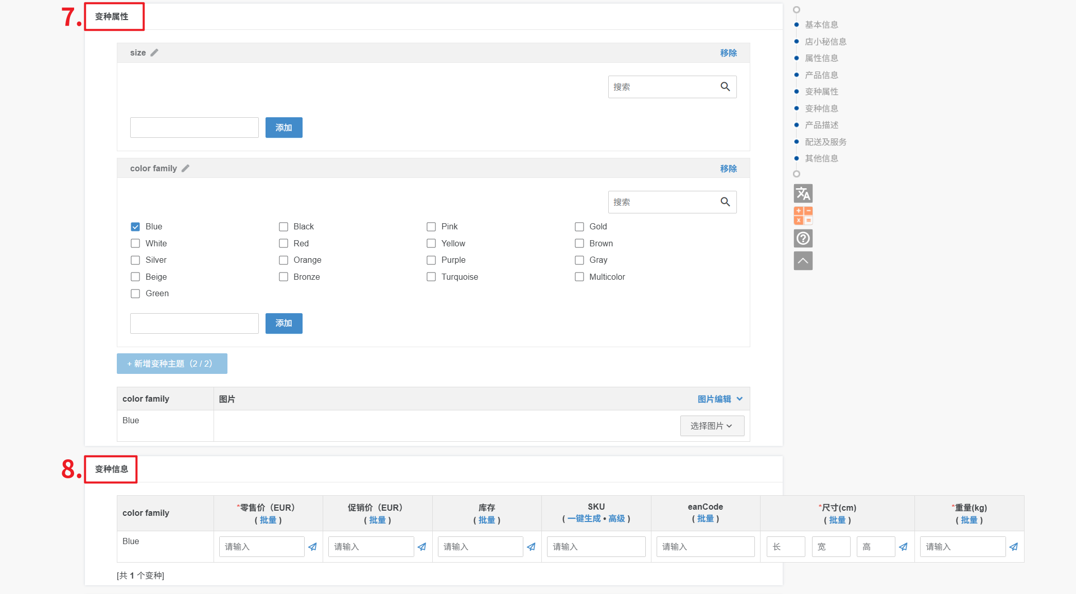 7、变种属性:部分分类会自带必填变种主题,比如服装类,会自带 Size(尺寸)、Color(颜色)