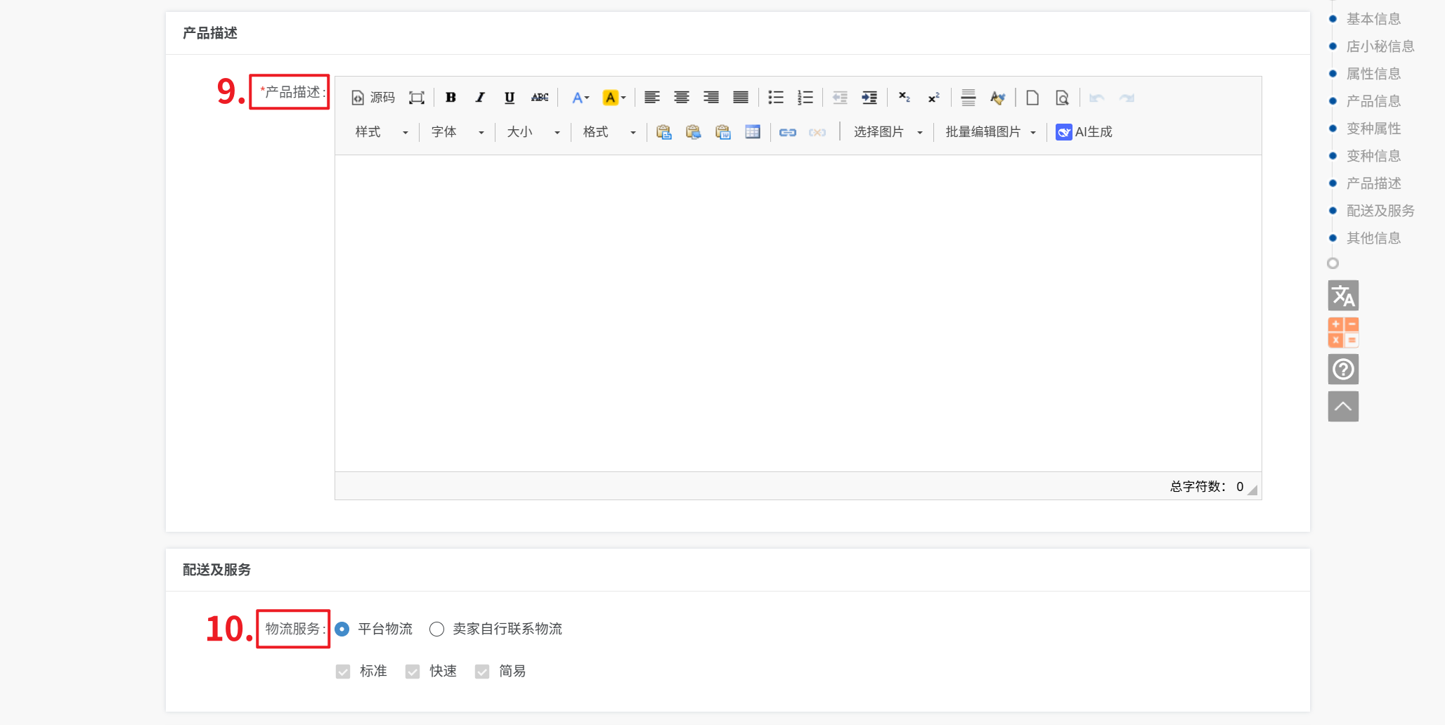 9、产品描述:可添加文字+图片,无法单独设置PC端和移动端描述,图片像素要求330*330到 5000*5000