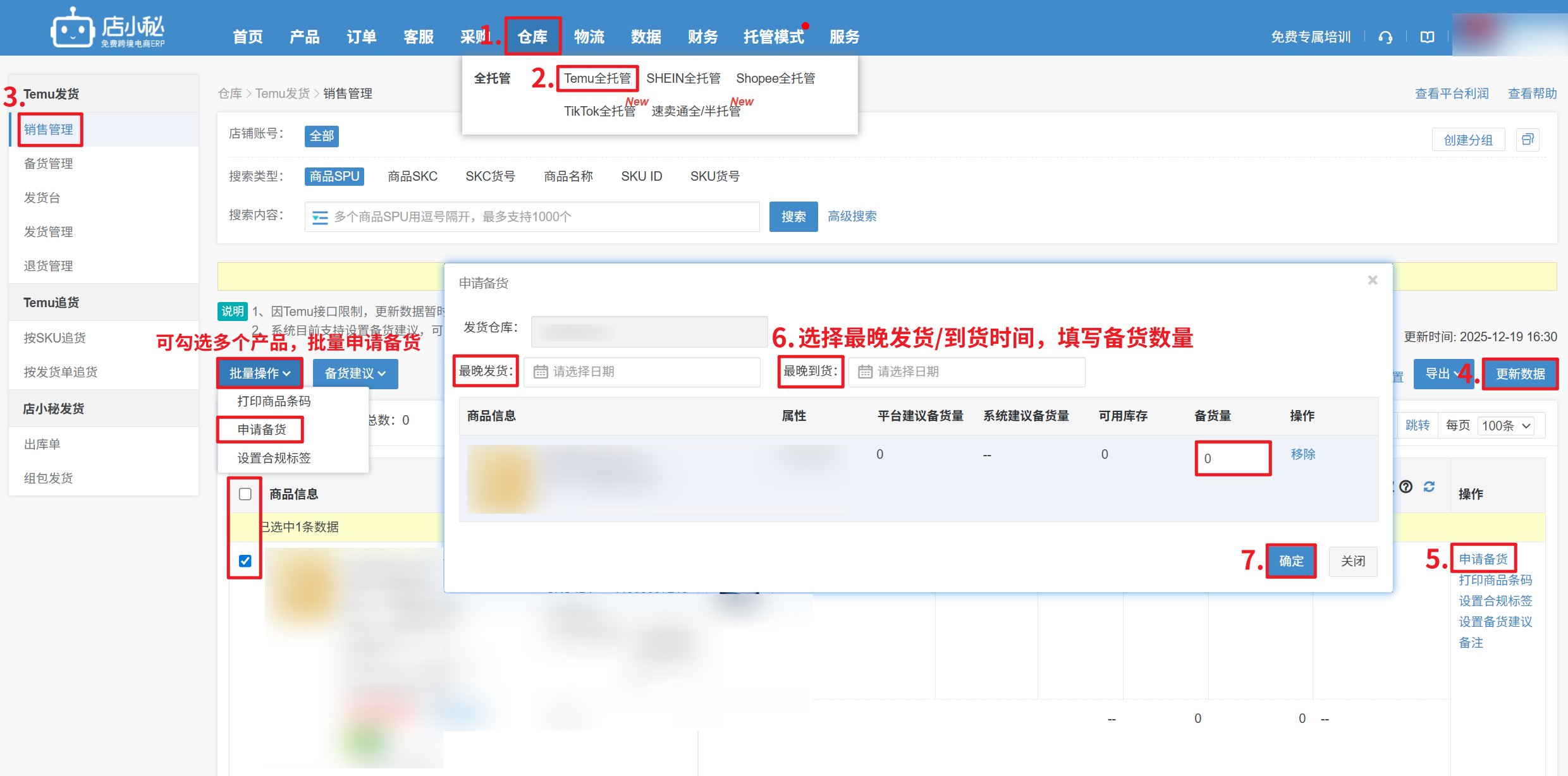 第一步:【仓库—Temu全托管—销售管理—更新数据—单个/批量申请备货—选择最晚发货/到货时间—填写备货数量—确定】