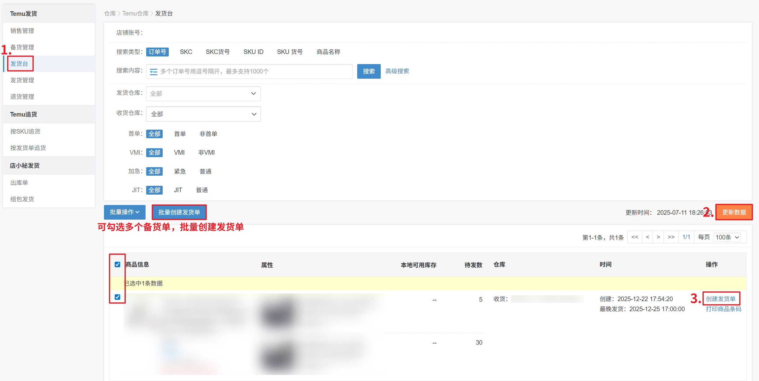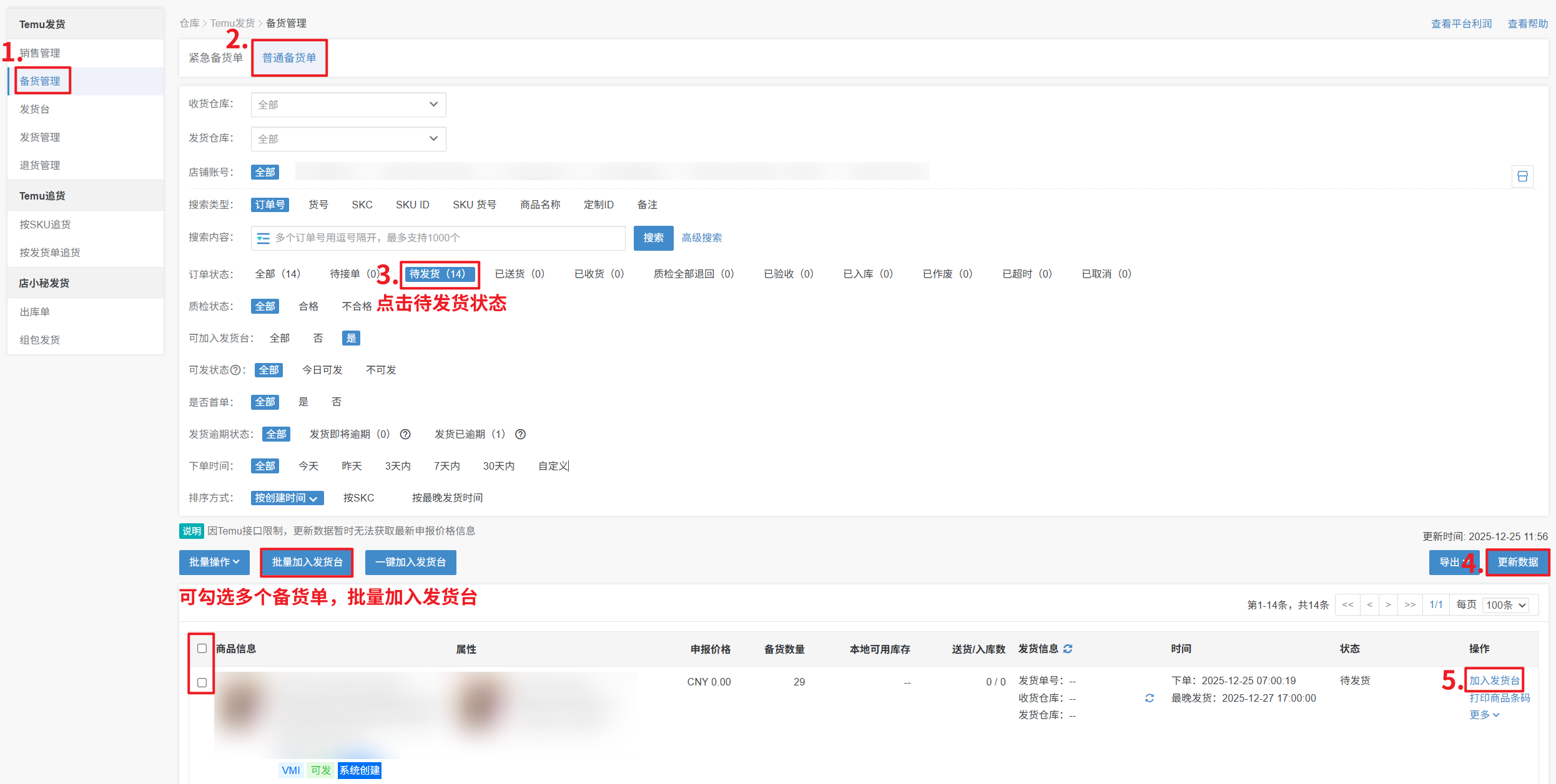 第二步:【备货管理—普通备货单—待发货—更新数据—单个/批量加入发货台】