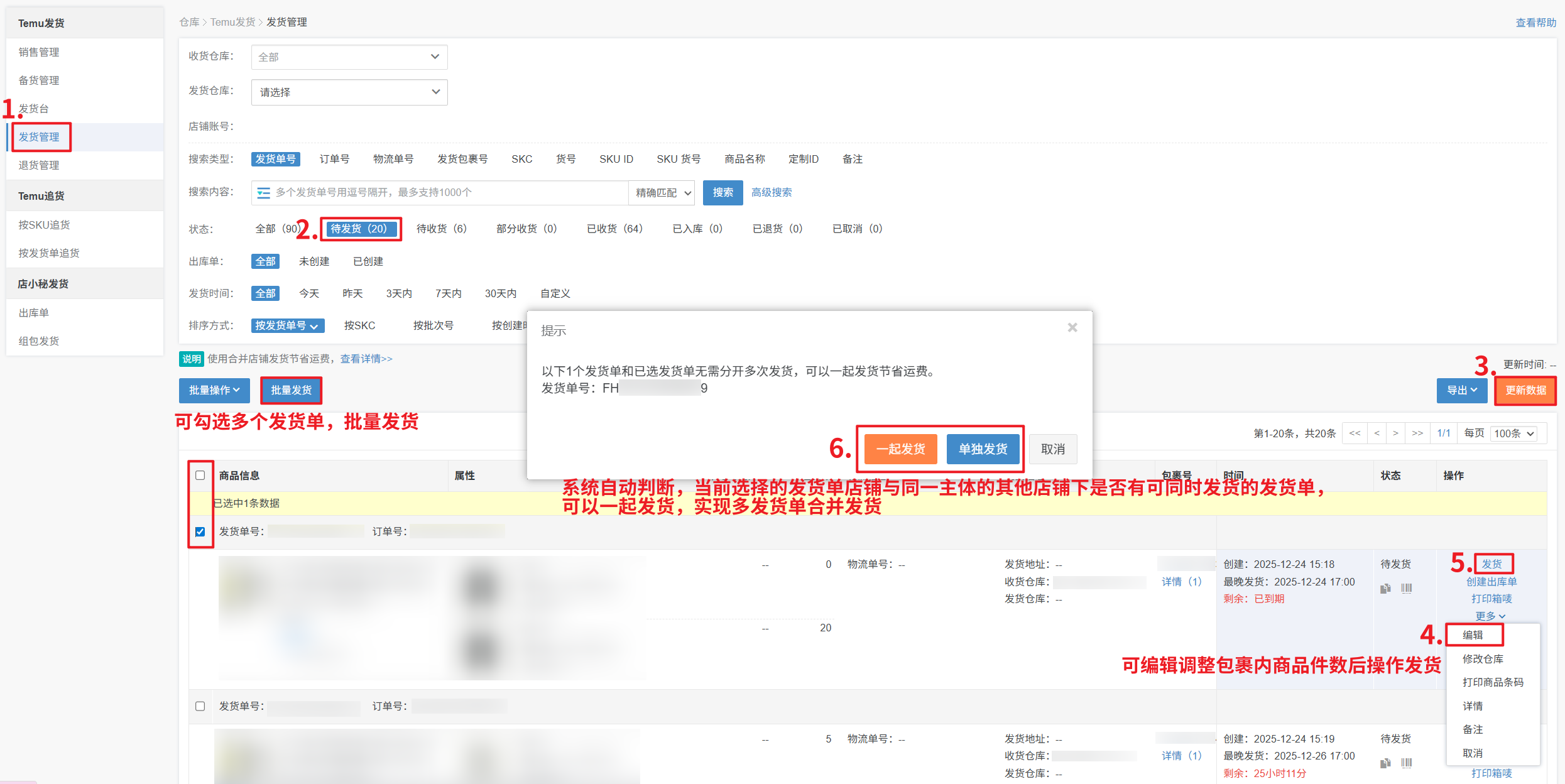 2、Temu店铺后台合并创建的发货单,不支持在小秘操作发货