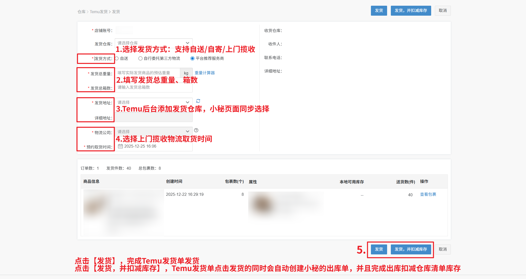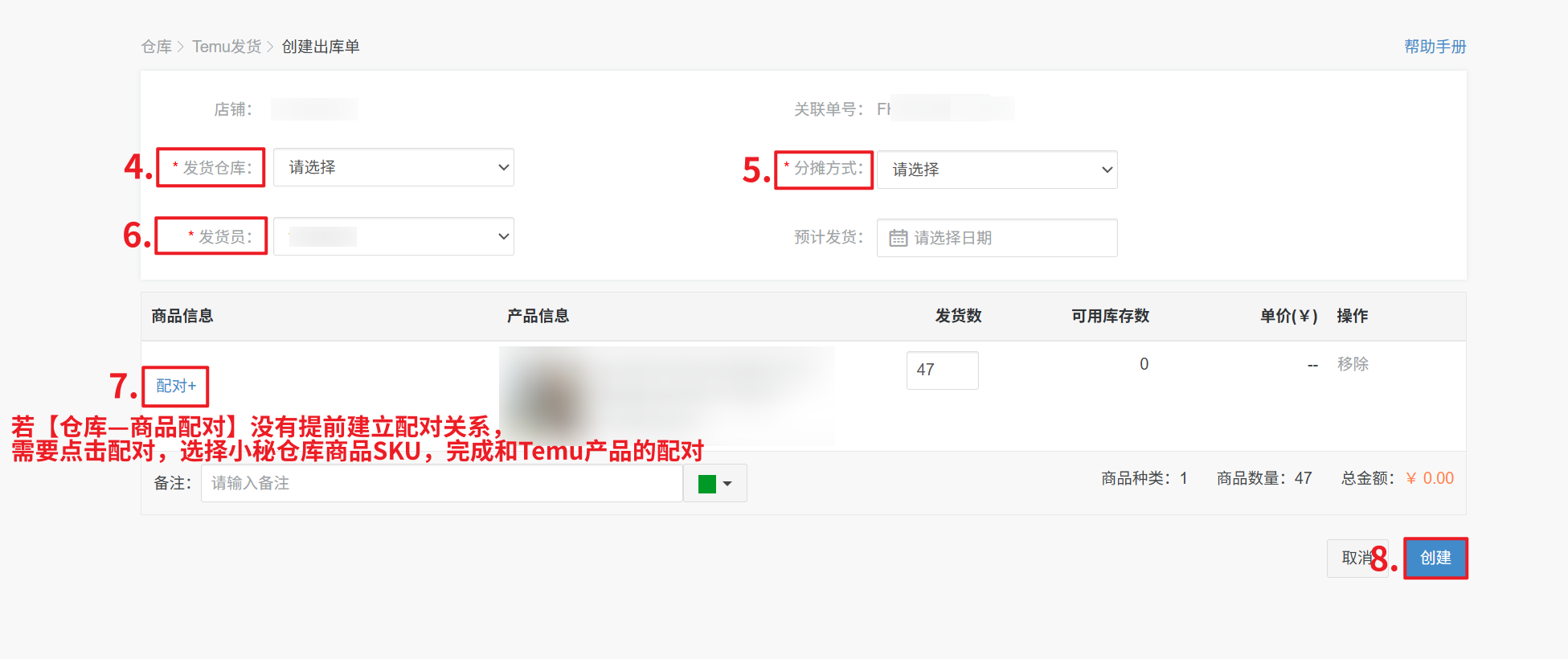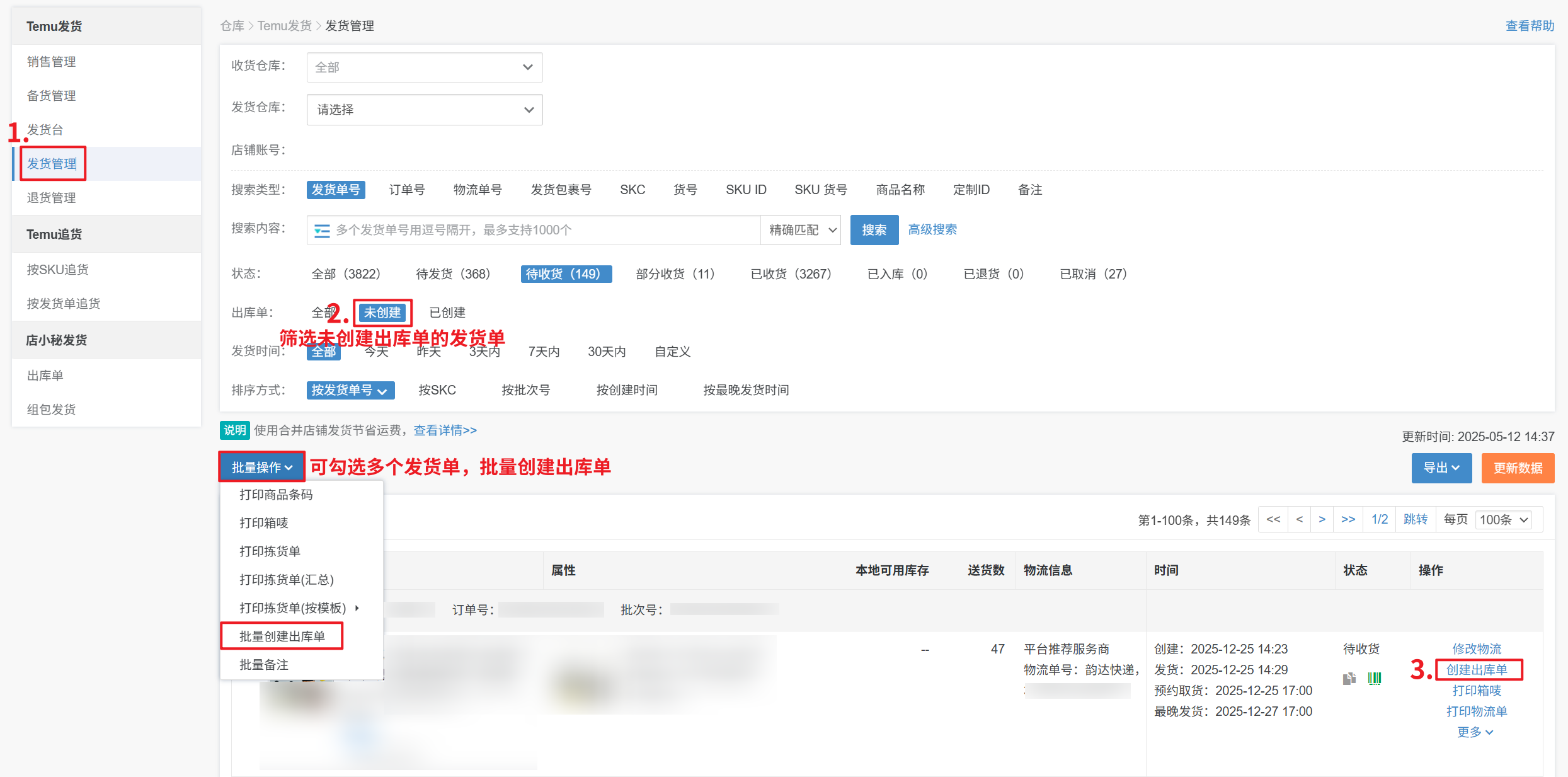 第六步:若Temu发货单在操作发货时,没有创建小秘的出库单,可在发货管理单独创建