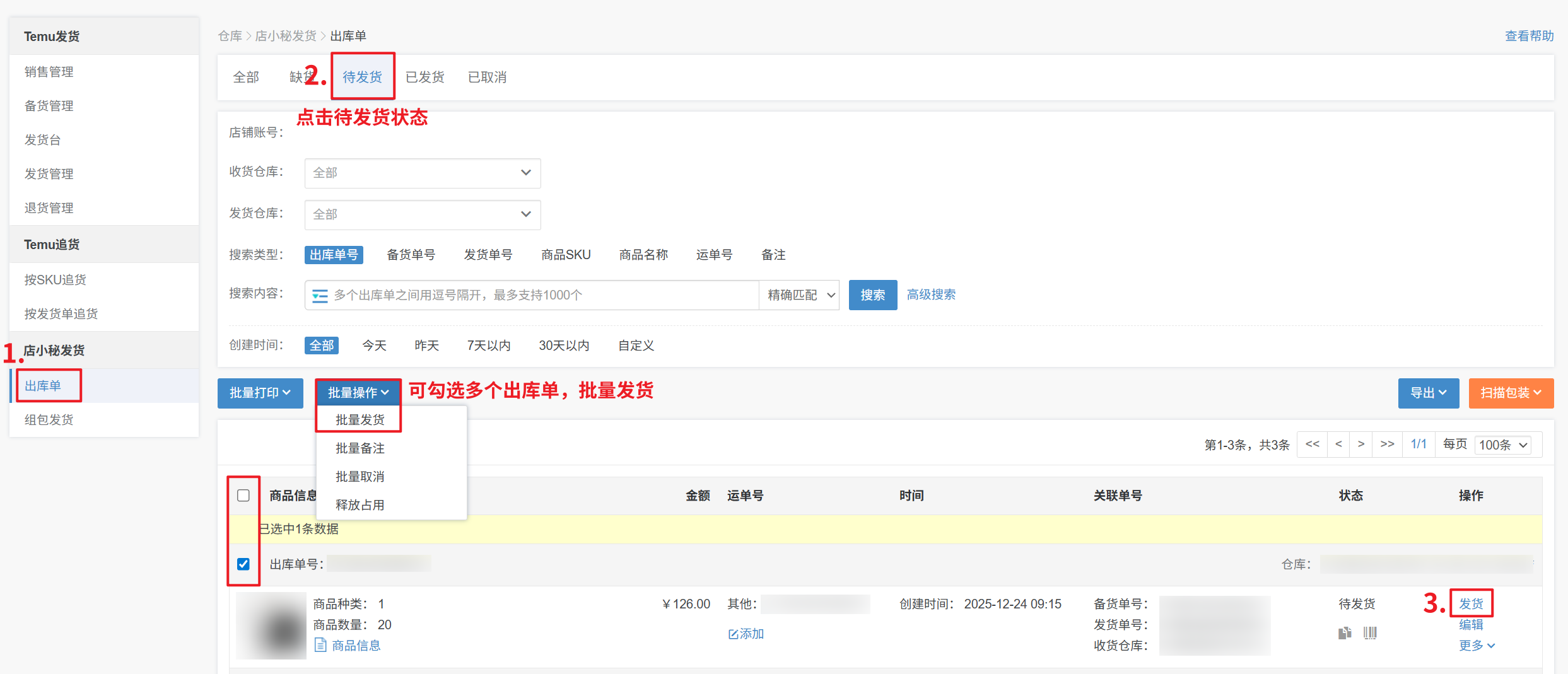 第七步:【出库单—待发货状态—单个/批量发货,就会扣减小秘仓库清单库存】