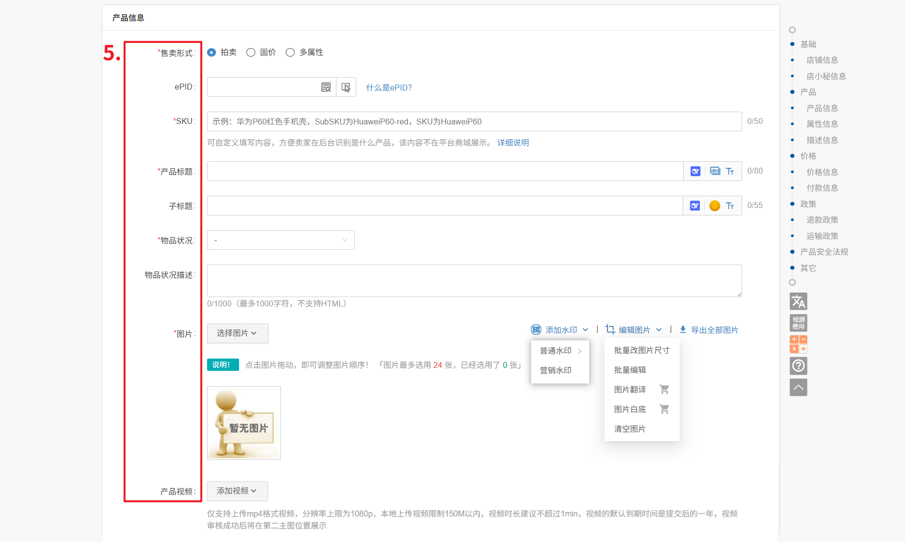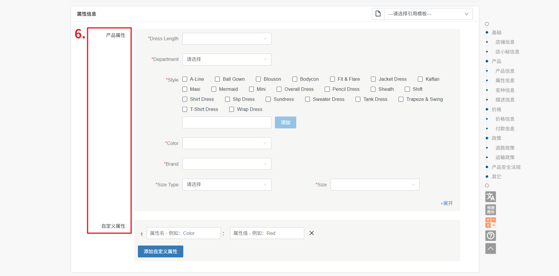 ① 产品属性: 不同的产品分类,产品属性不一样,根据实际产品选择即可,带*号必填