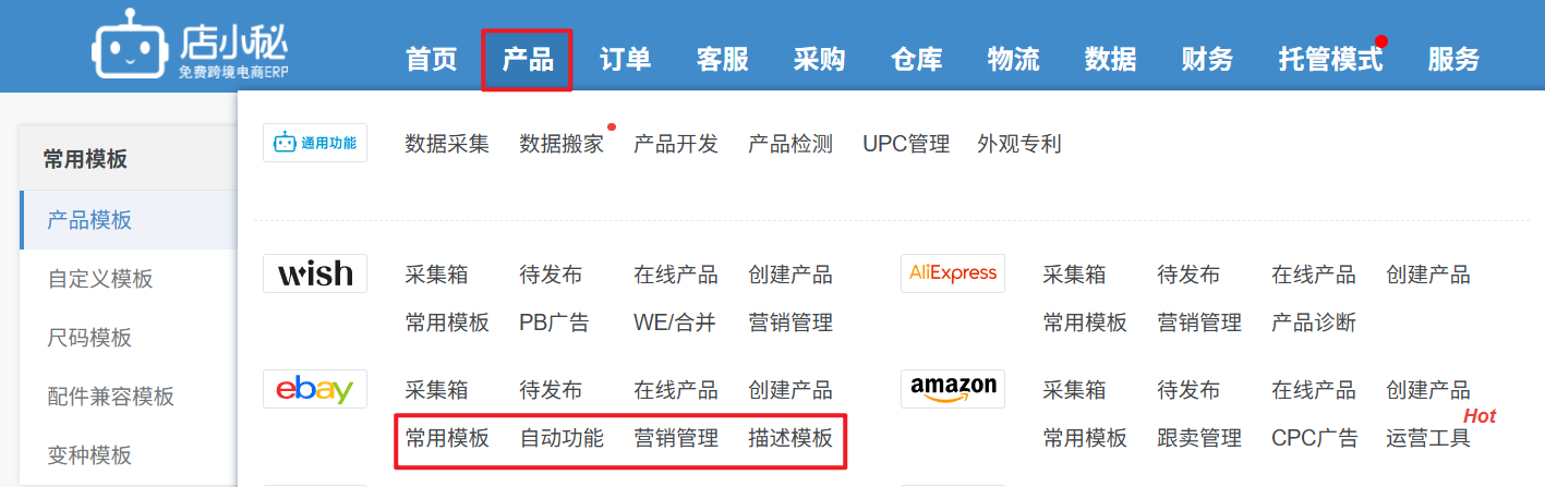 ④ 描述模板:购买描述模板,设置内容信息,产品编辑页面可直接选择描述模板,避免描述信息重复输入