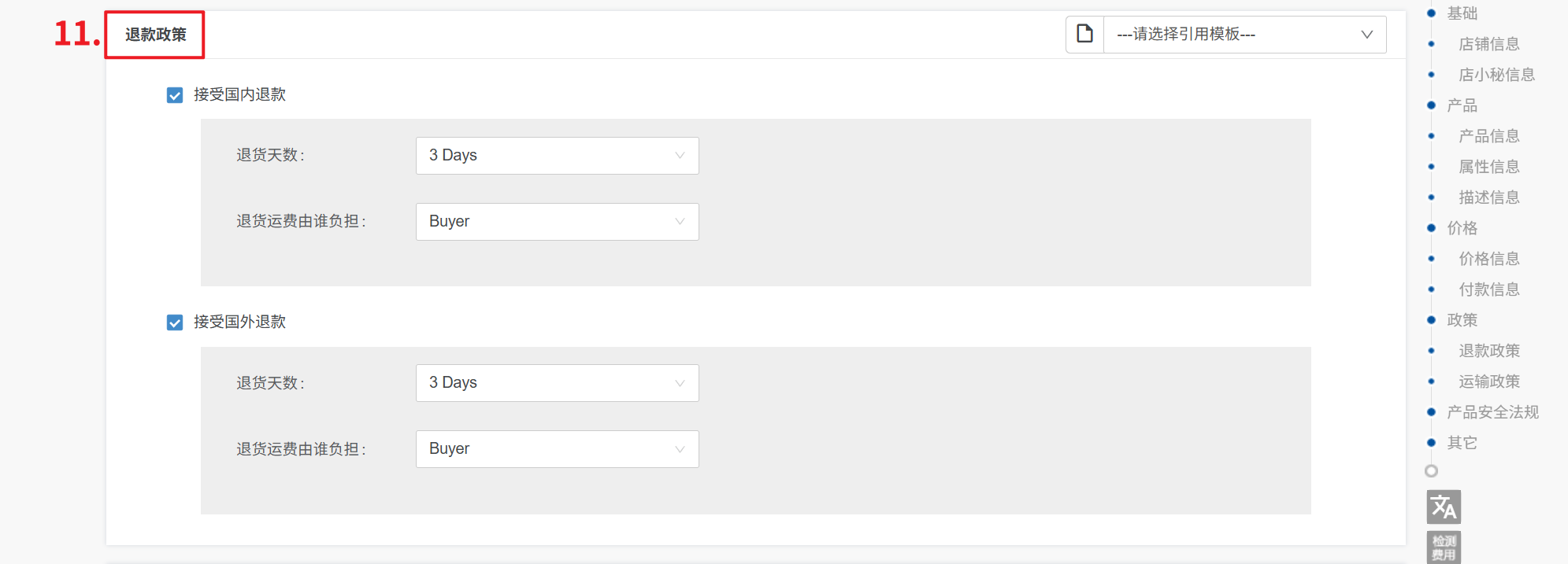 例如:物品所在地在中国,设置接受了国内退款,前台页面选中国就会显示可退款
