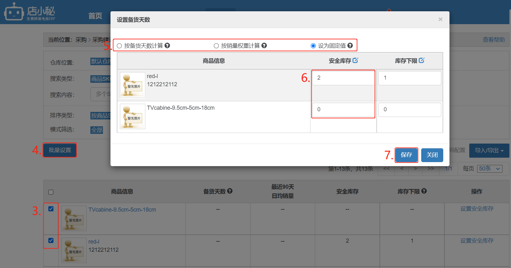 ②【仓库—仓库清单—点击安全—跳转到设置安全库存页面,勾选商品—批量设置—选择计算方式—填写信息—保存】