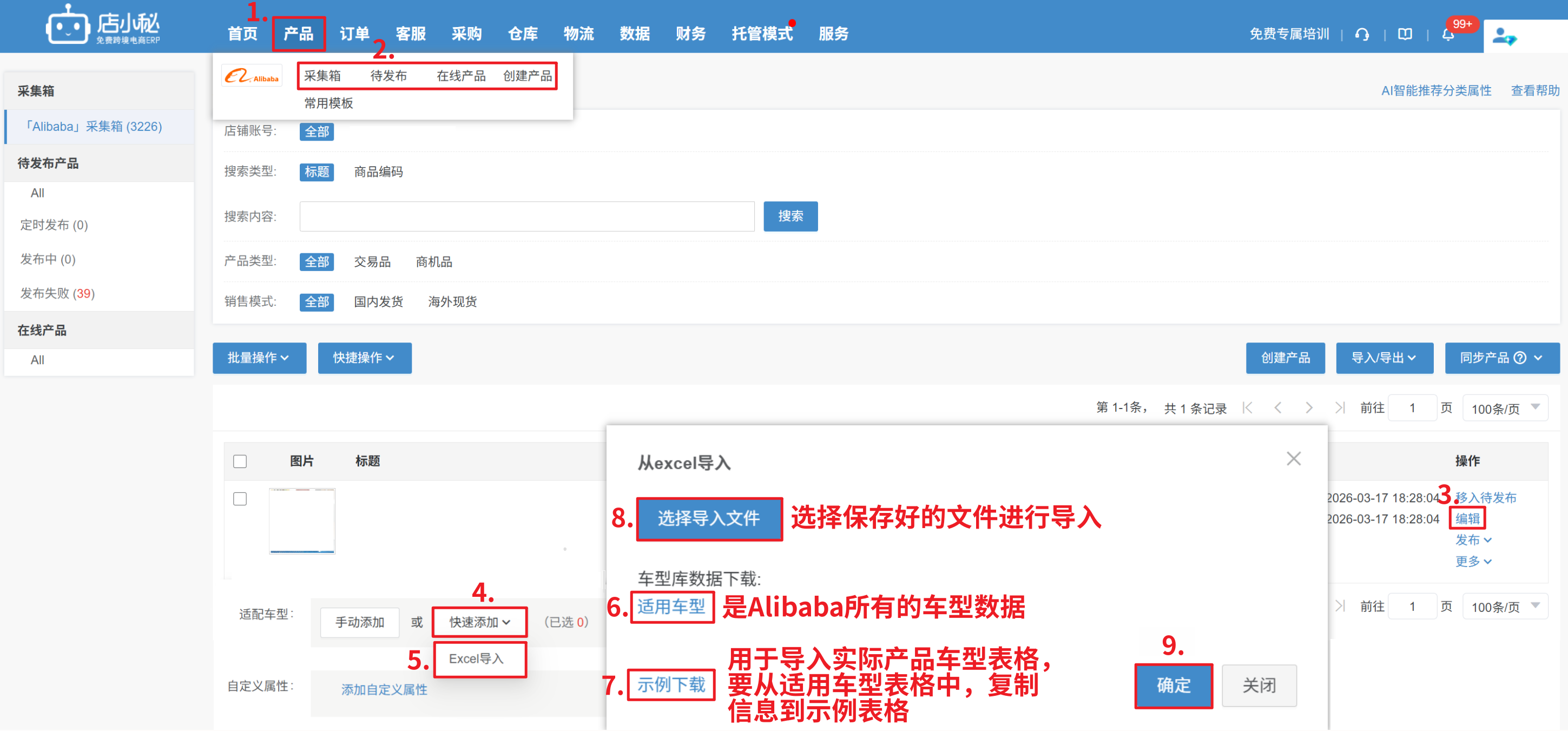 【产品—采集箱/待发布/在线产品/创建产品—适配车型—快速添加—Excel导入—下载适用车型—示例下载—填写表格—选择导入文件—确定】