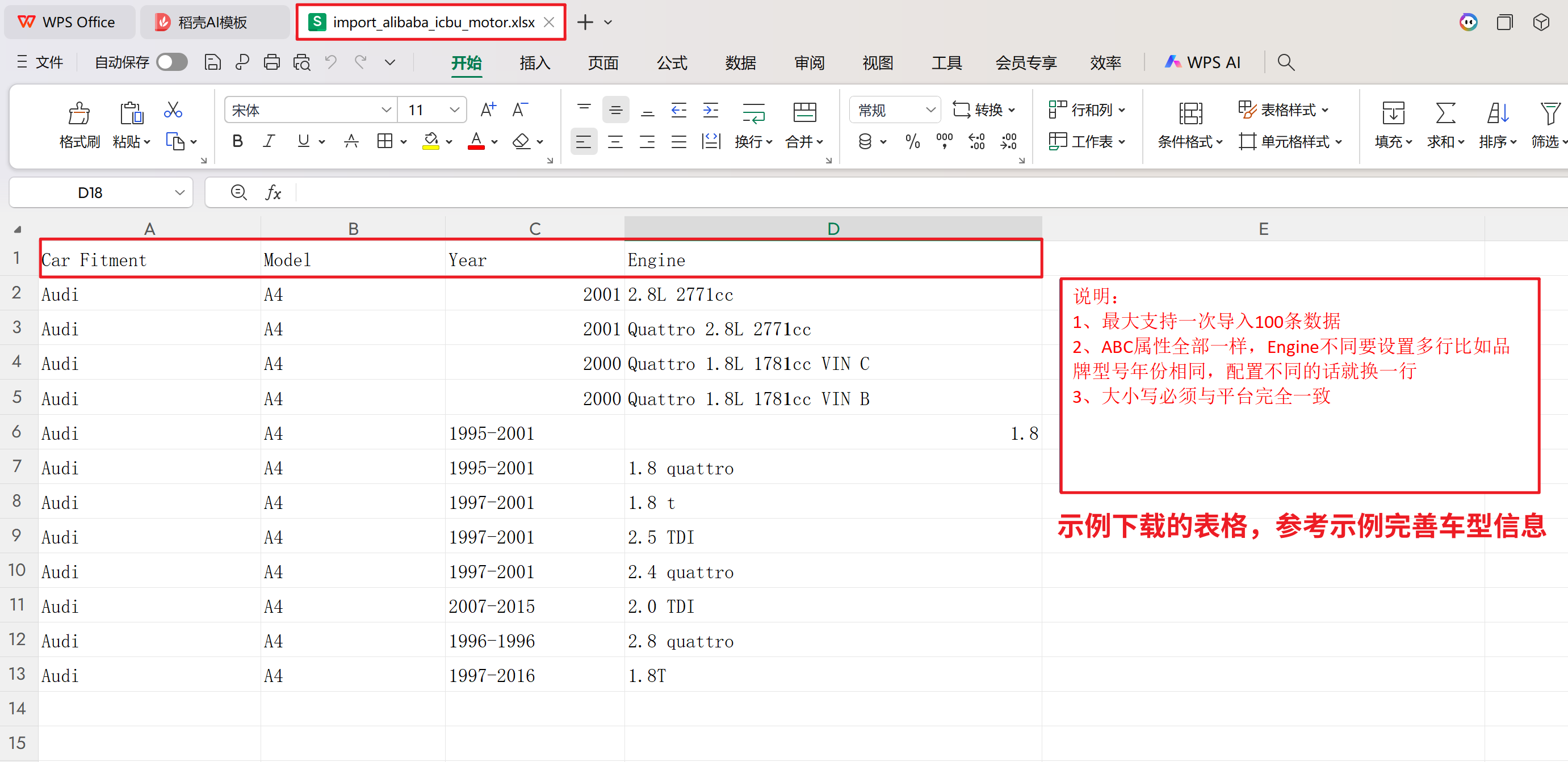 注意:示例表格中,清除原有车型数据,只保留表头,然后从适用车型数据表格中复制过来添加