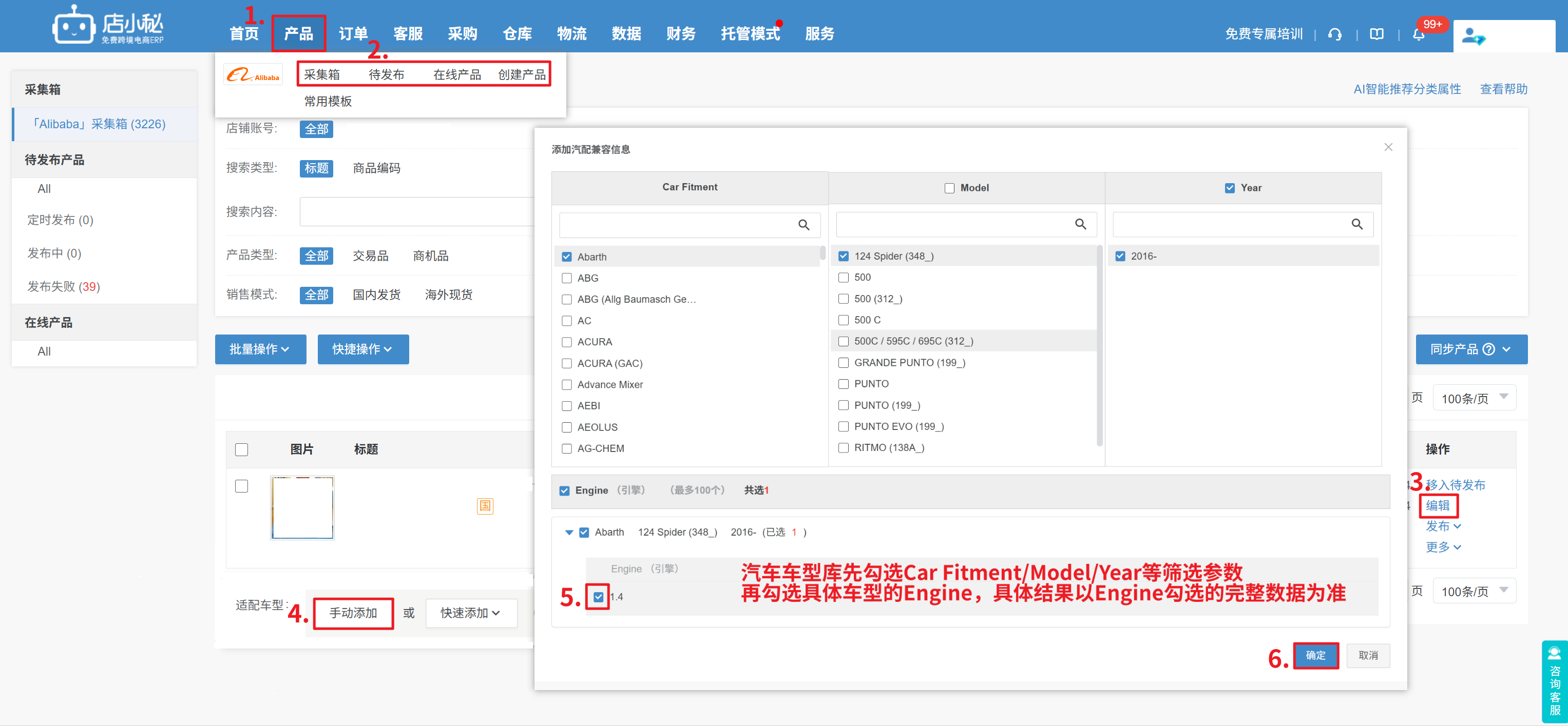 【产品—采集箱/待发布/在线产品/创建产品—编辑—适配车型—手动添加—选择对应车型数据—保存】