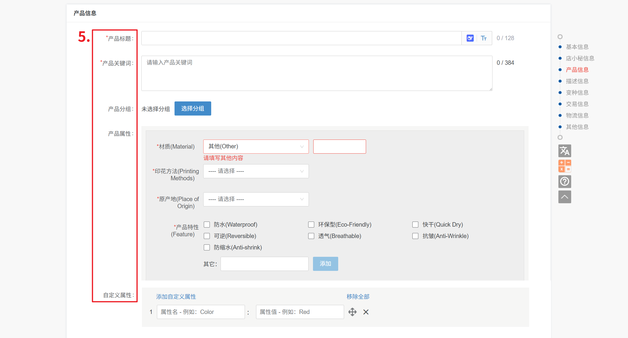 ⑤ 自定义属性:指卖家根据商品特性自行设置的属性字段,用于补充平台推荐属性的不足,以提升商品曝光和买家搜索体验