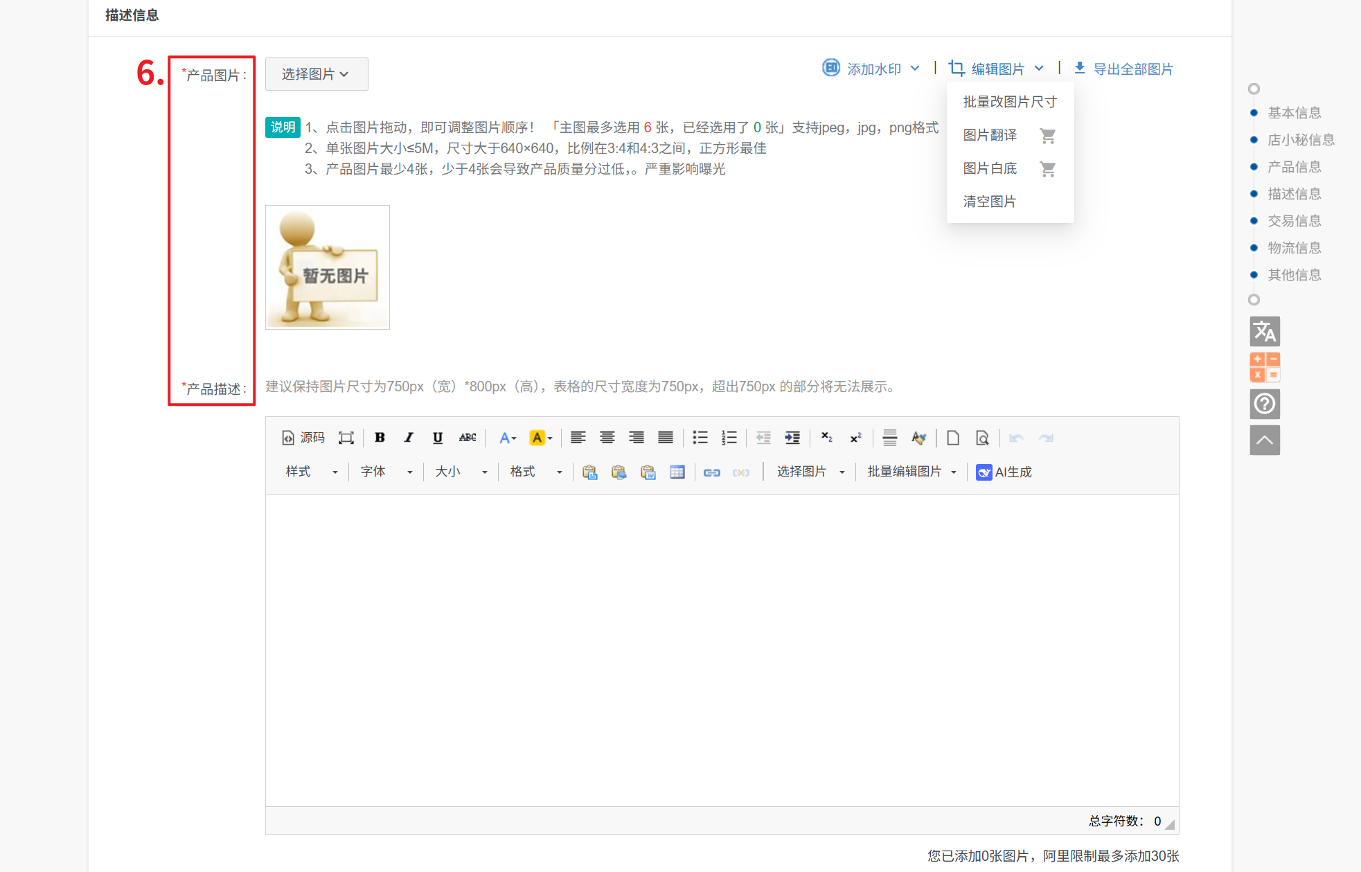 ② 产品描述(普通描述):1、可上传文字图片,共50000字符,可上传30张图片