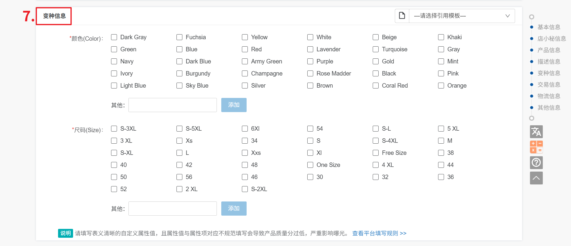 7、变种信息:1、不同的分类,变种信息不同,根据实际产品选择即可,也可以自定义添加变种信息