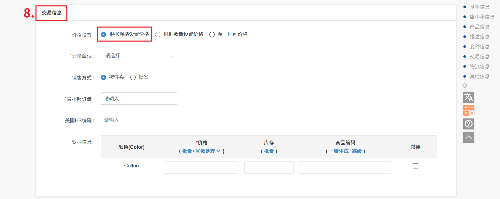 ① 价格设置:【根据规格设置价格】— 按照颜色尺寸等变种信息设置价格