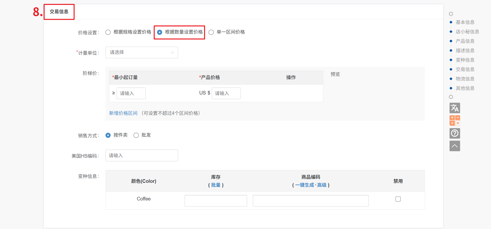 ② 价格设置:【根据数量设置价格】 即按照最小起订量设置价格