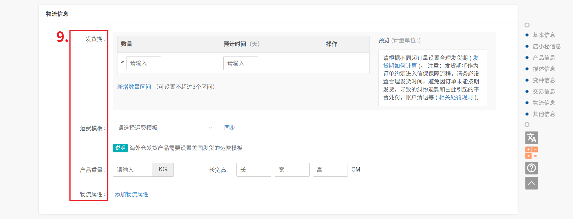 ① 发货期:可设置不同的数量,不同的发货期,右侧预览展示效果