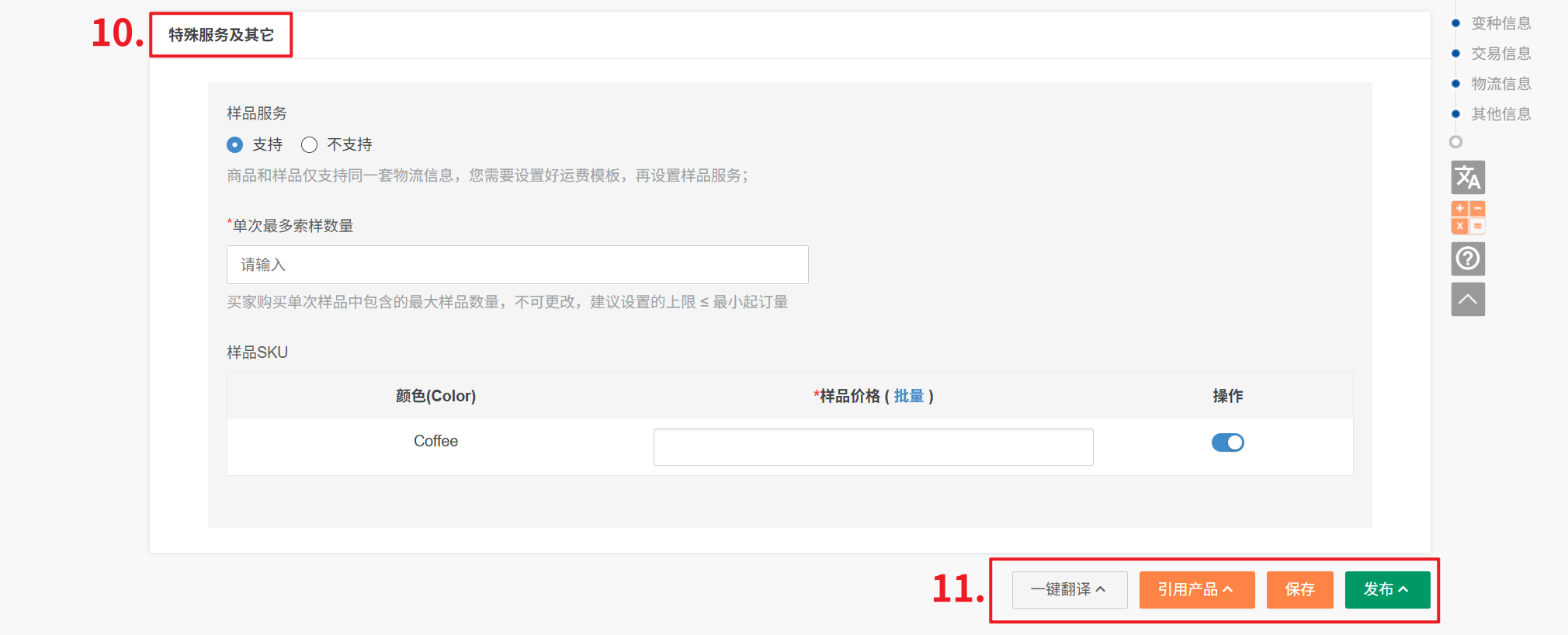 10、特殊服务及其它:可选择开启样品服务