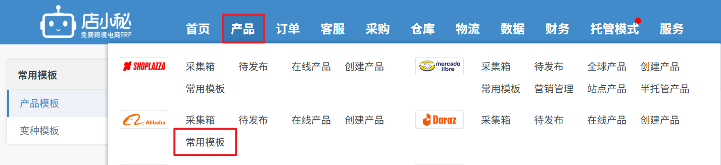 ① 常用模板:可将产品通用的信息内容创建成模板,在创建编辑产品时可以直接引用模板信息