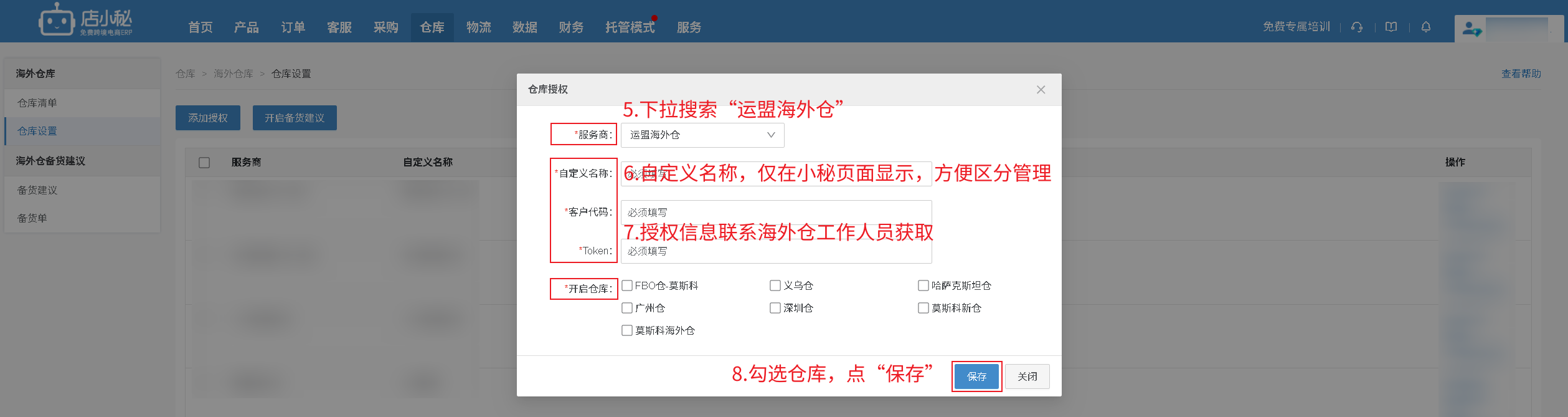 【仓库—海外仓库—仓库设置—添加授权—选择“运盟海外仓