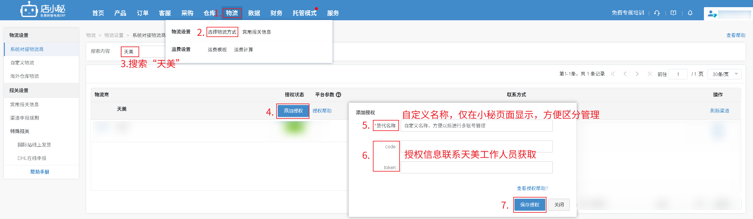 第一步:【物流—选择物流方式—搜索“天美’”—添加授权—自定义物流商名称—授权信息联系天美工作人员获取—保存授权】