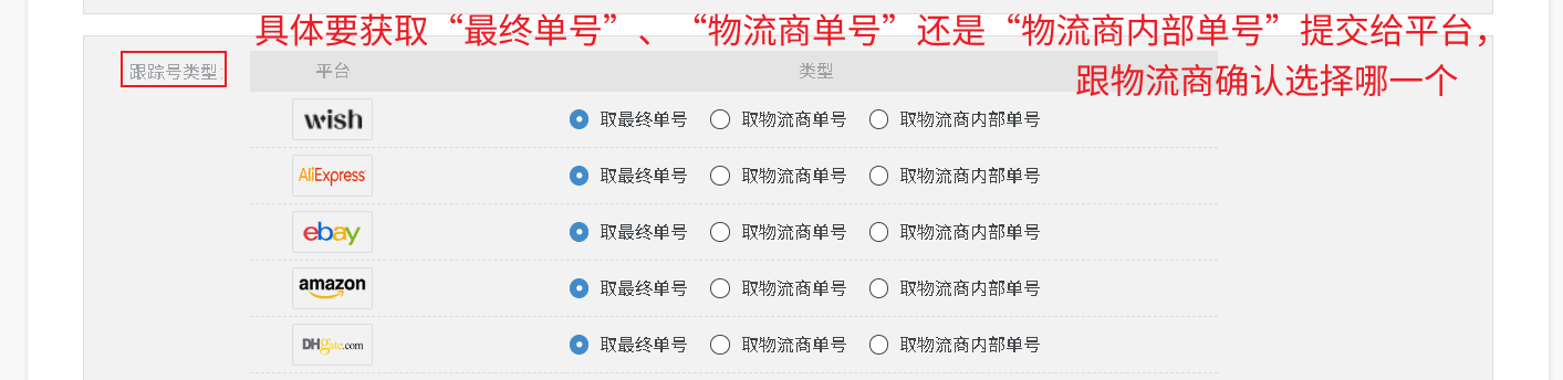 【跟踪号类型】:具体要获取“最终单号”、“物流商单号”还是“物流商内部单号”提交给平台,跟物流商确认选择哪一个。