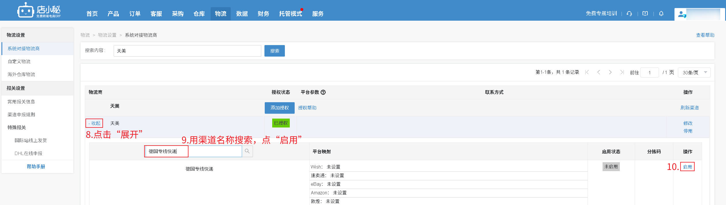 确认清楚后,在店小秘搜索这个渠道的名称,点启用,处理订单就可以选择“已启用”的渠道申请运单号。