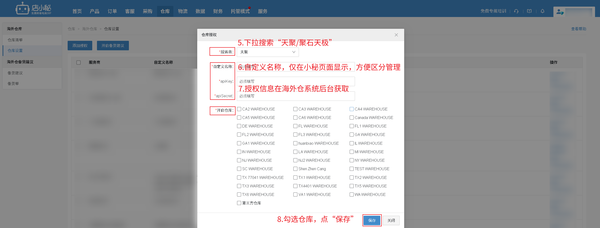【仓库—海外仓库—仓库设置—添加授权—选择对应的海外仓(天聚/聚石天极)—自定义名称—登录海外仓系统后台获取—勾选