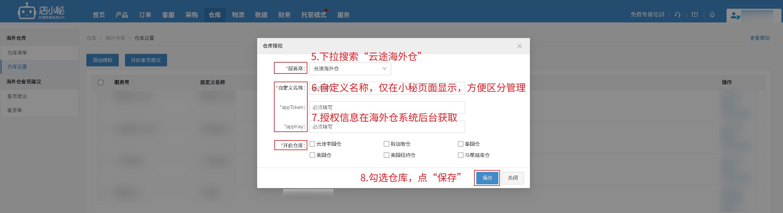 【仓库—海外仓库—仓库设置—添加授权—选择“云途海外仓”—自定义名称—登录海外仓系统后台获取—勾选仓库—保存即可】