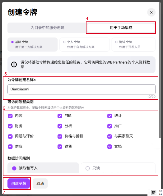【野莓后台—右上角账号信息—API集成—创建令牌—自定义令牌名称—访问部分注意全部选择—将生成的token信息复制到店小秘页面】