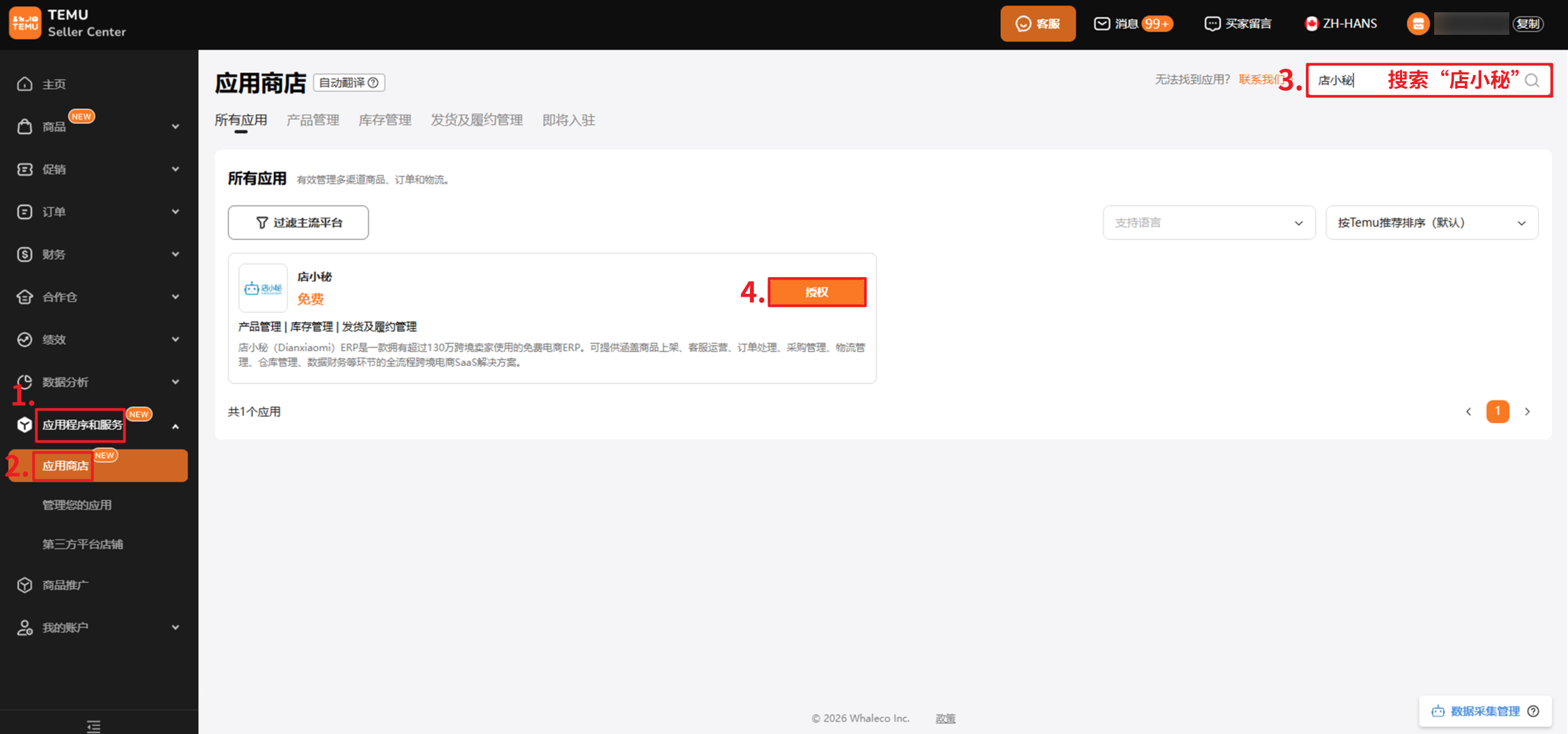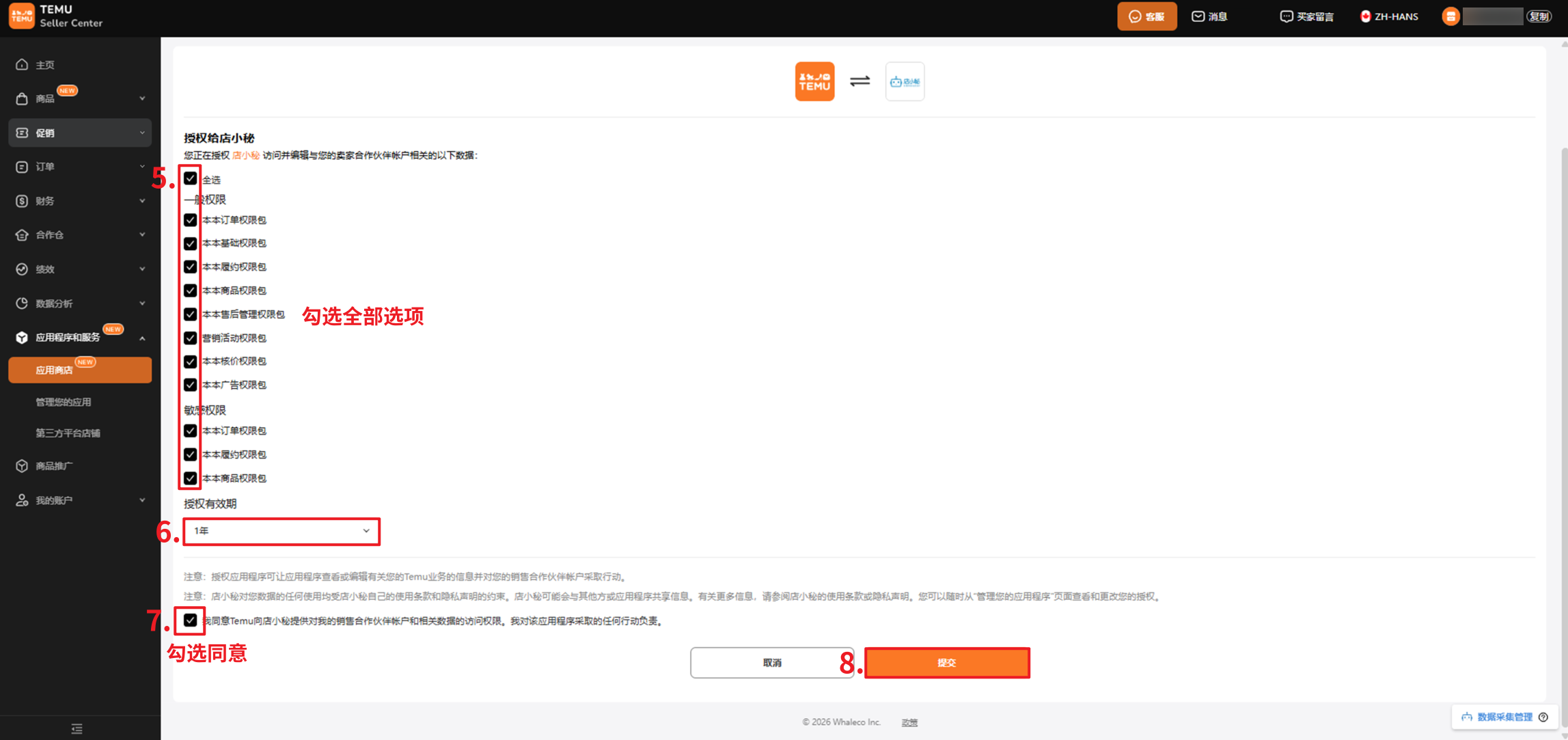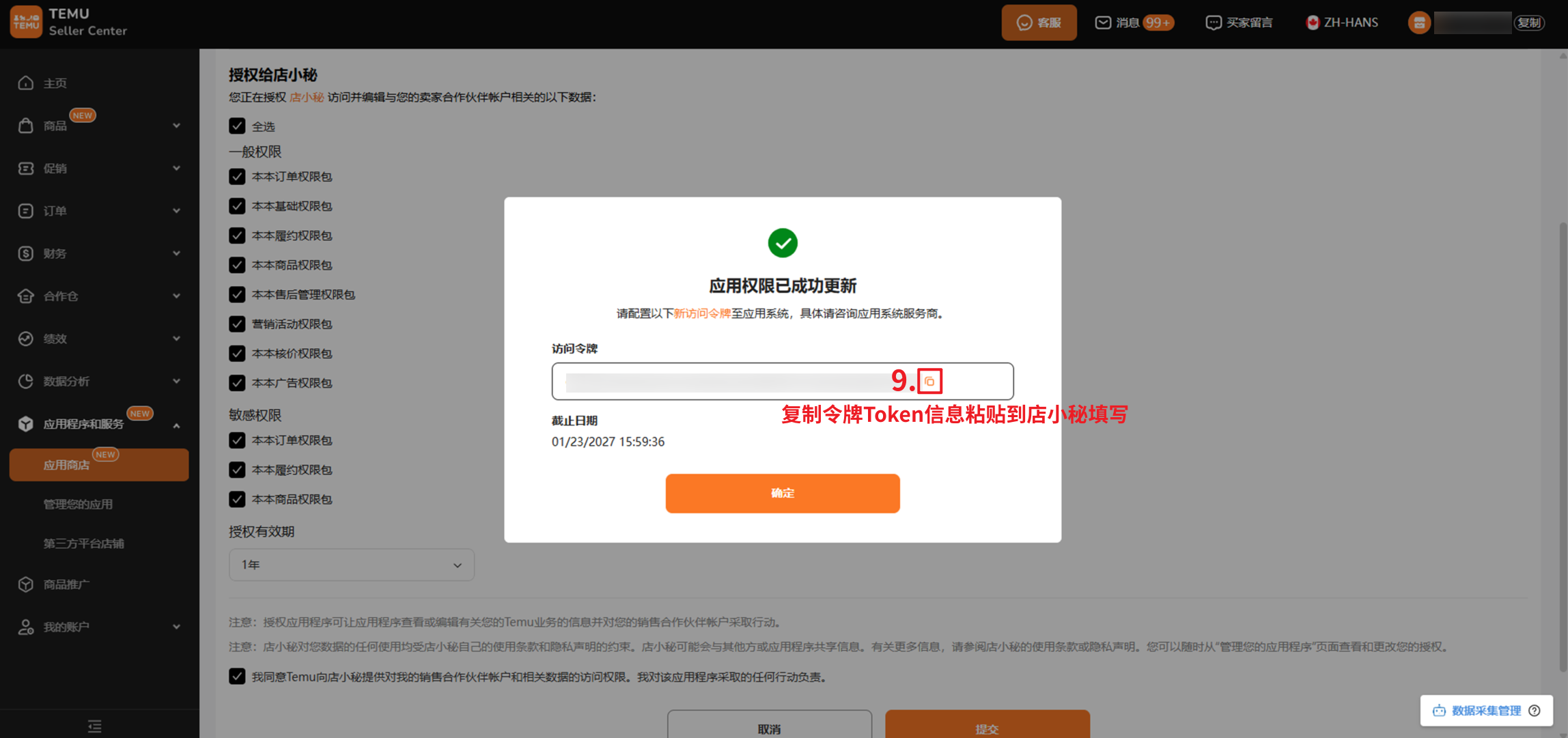 【Temu本土后台—应用程序和服务—应用商店—搜索“店小秘”—授权—勾选全部权限/选择授权有效期—点击提交—获取Token授权信息