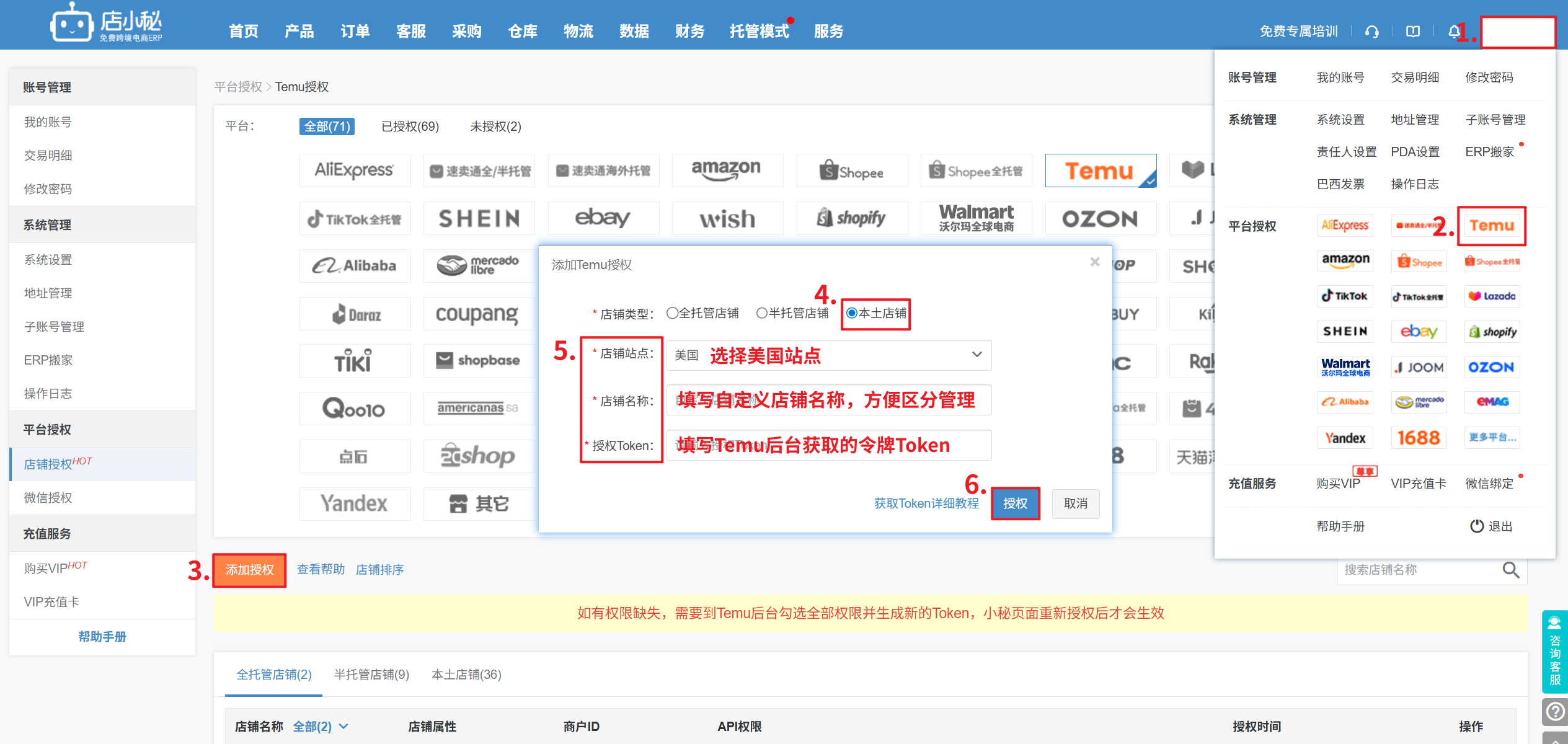 登录店小秘主账号—用户名—平台授权—Temu—添加授权—店铺类型选本土店铺—选美国站点—自定义店铺名称—填写授权Token—授权