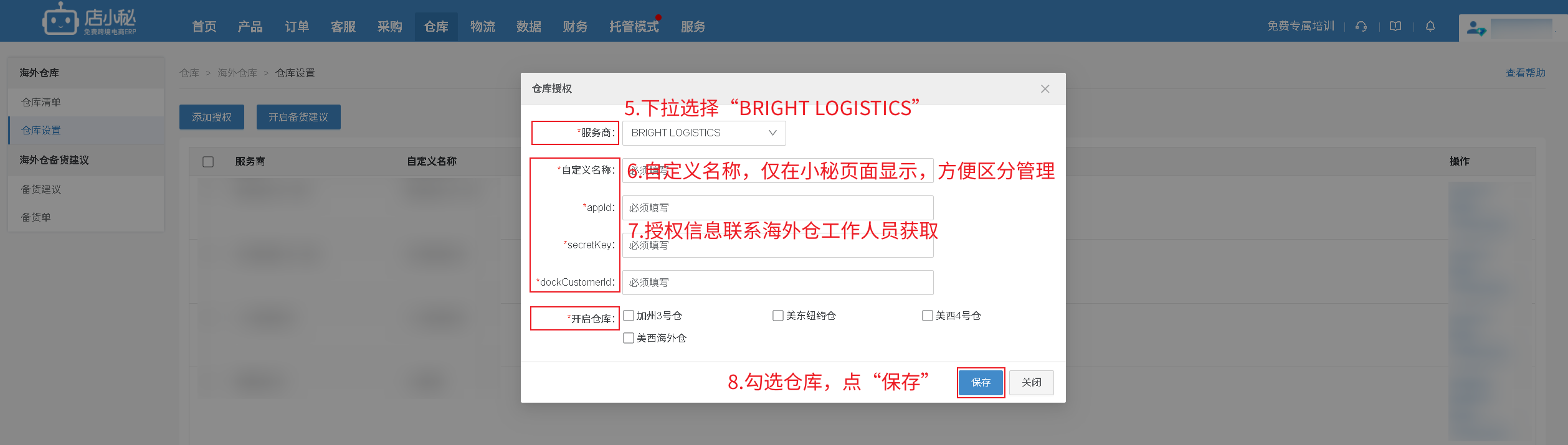 ”—自定义名称—联系海外仓工作人员获取—勾选仓库—保存即可】