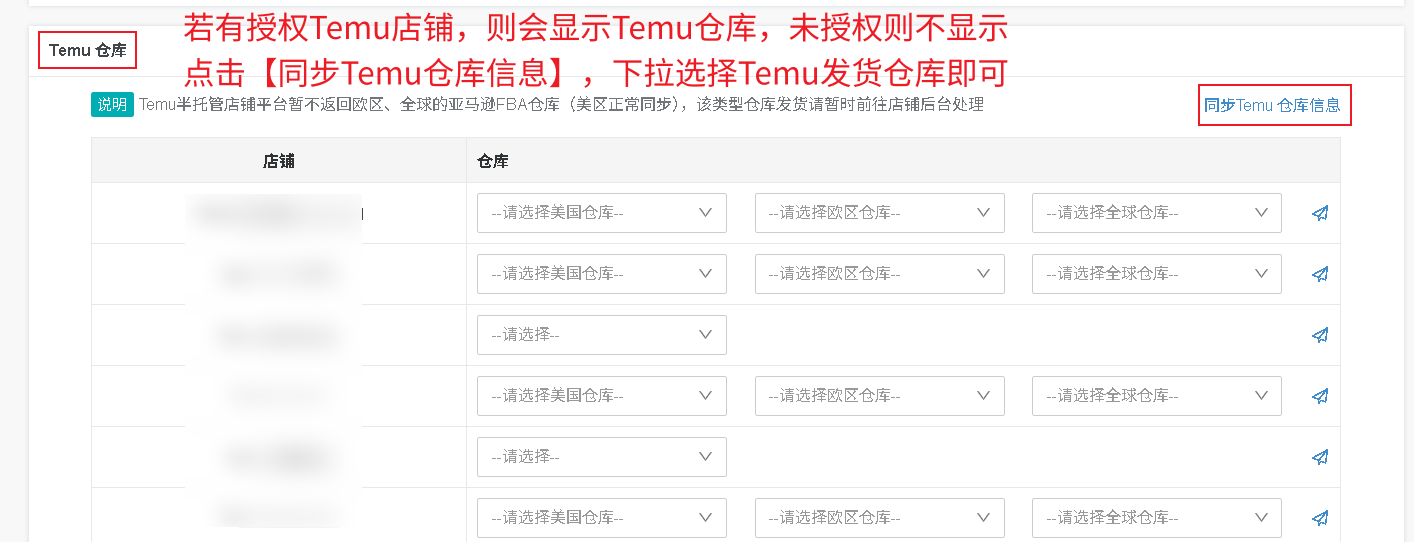 若有授权Temu店铺,则显示该步骤,点击【同步Temu仓库信息】,下拉选择Temu发货仓库即可。