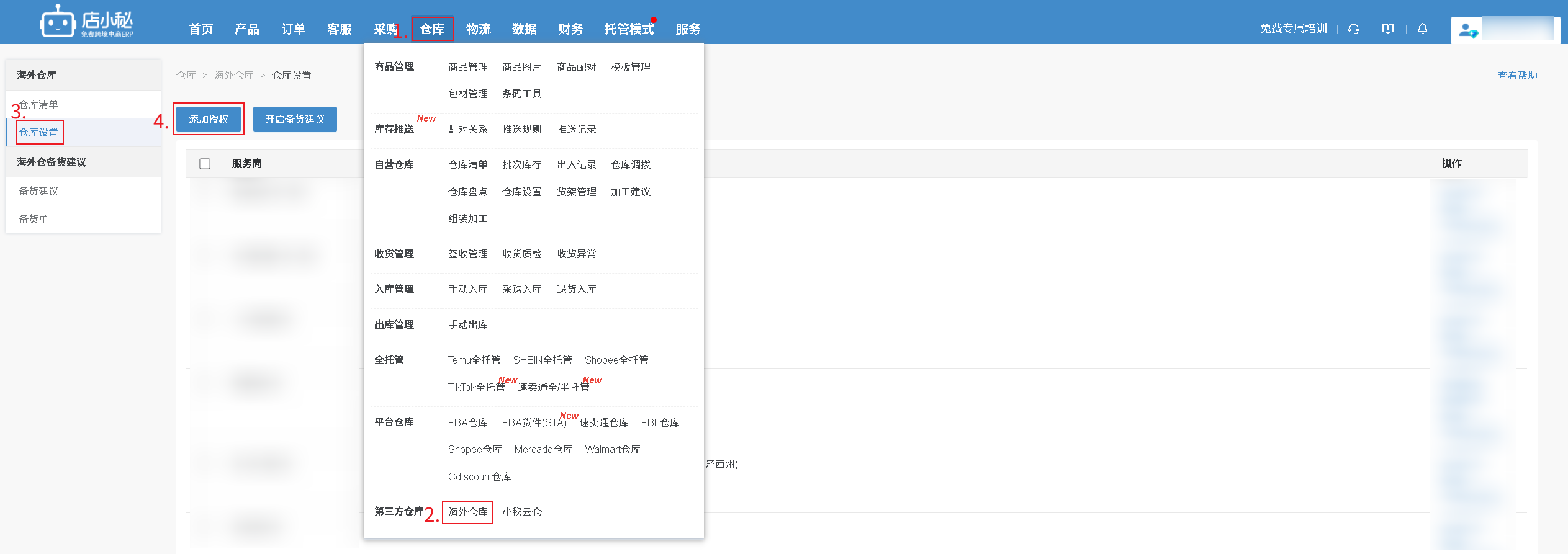【仓库—海外仓库—仓库设置—添加授权—选择“煦阳海外仓