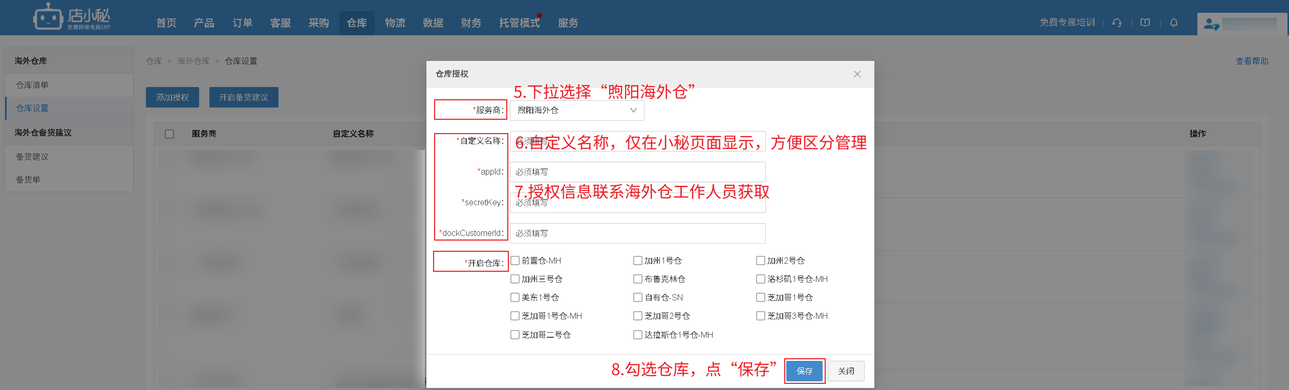 ”—自定义名称—联系海外仓工作人员获取—勾选仓库—保存即可】
