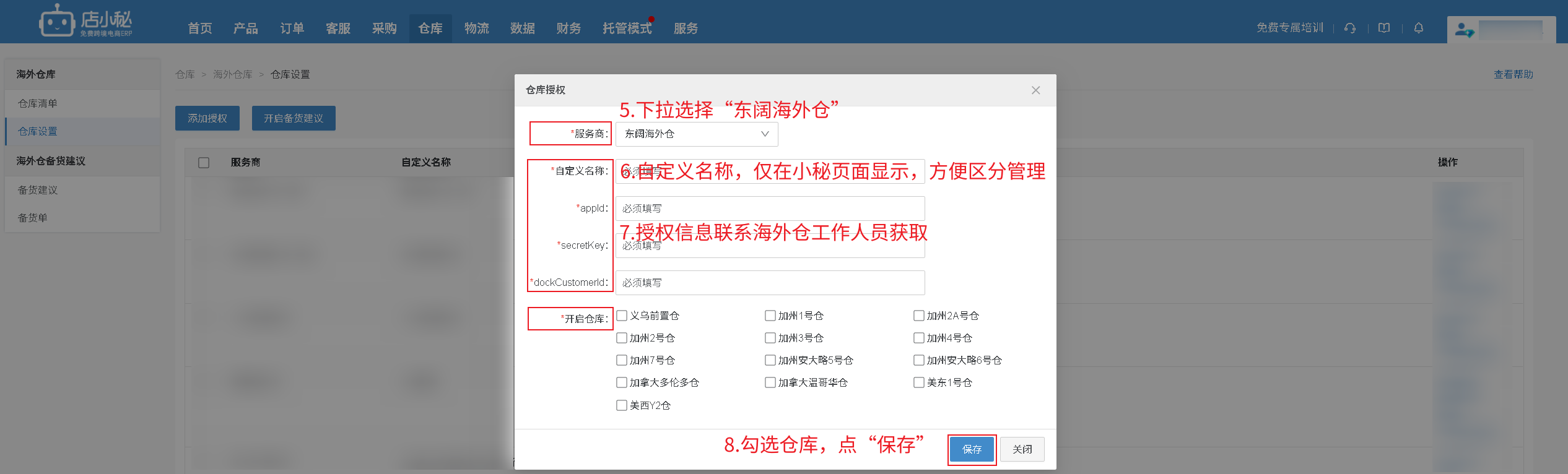 ”—自定义名称—联系海外仓工作人员获取—勾选仓库—保存即可】