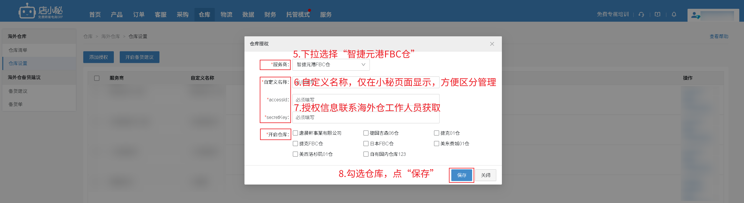 【仓库—海外仓库—仓库设置—添加授权—选择“智捷元港FBC仓