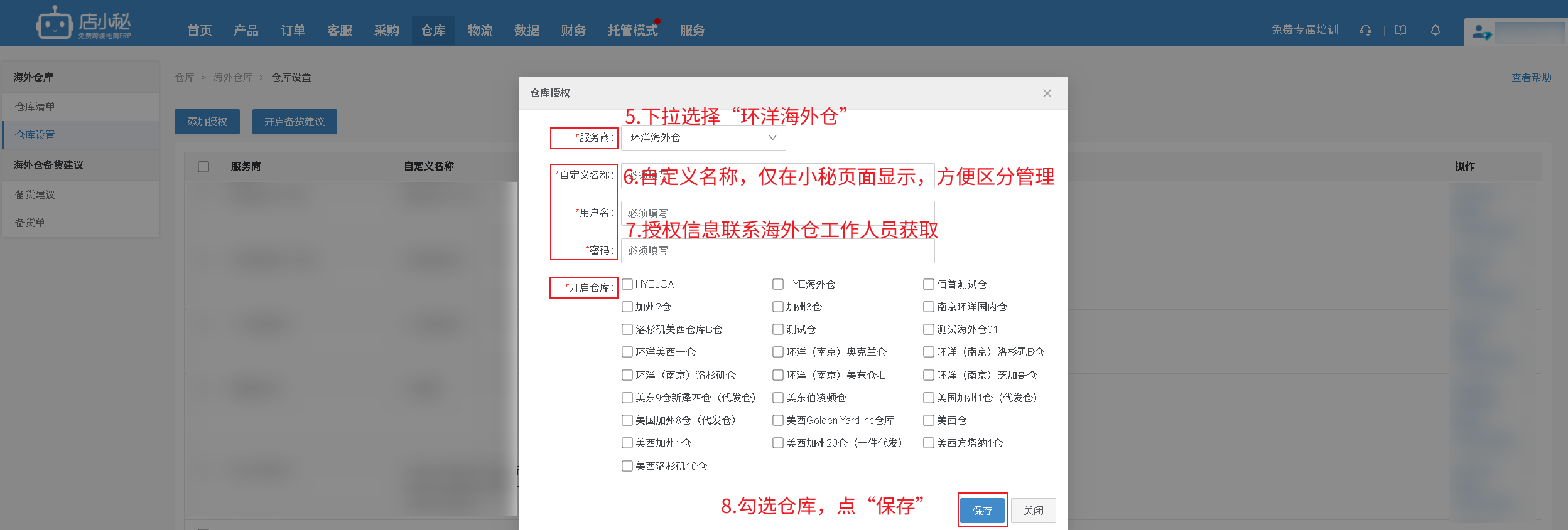 ”—自定义名称—联系海外仓工作人员获取—勾选仓库—保存即可】