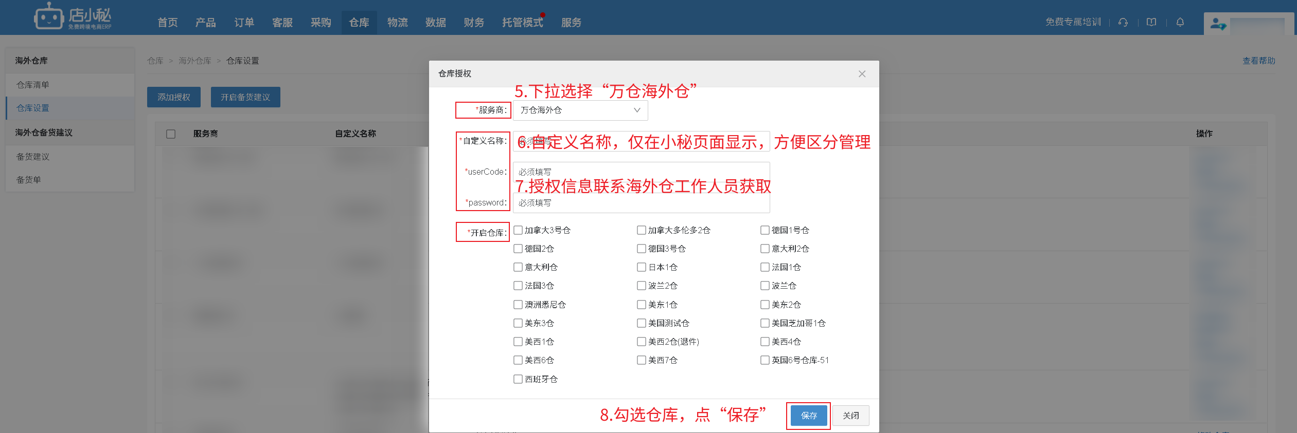 【仓库—海外仓库—仓库设置—添加授权—选择“万仓海外仓”—自定义名称—联系海外仓工作人员获取—勾选仓库—保存即可】