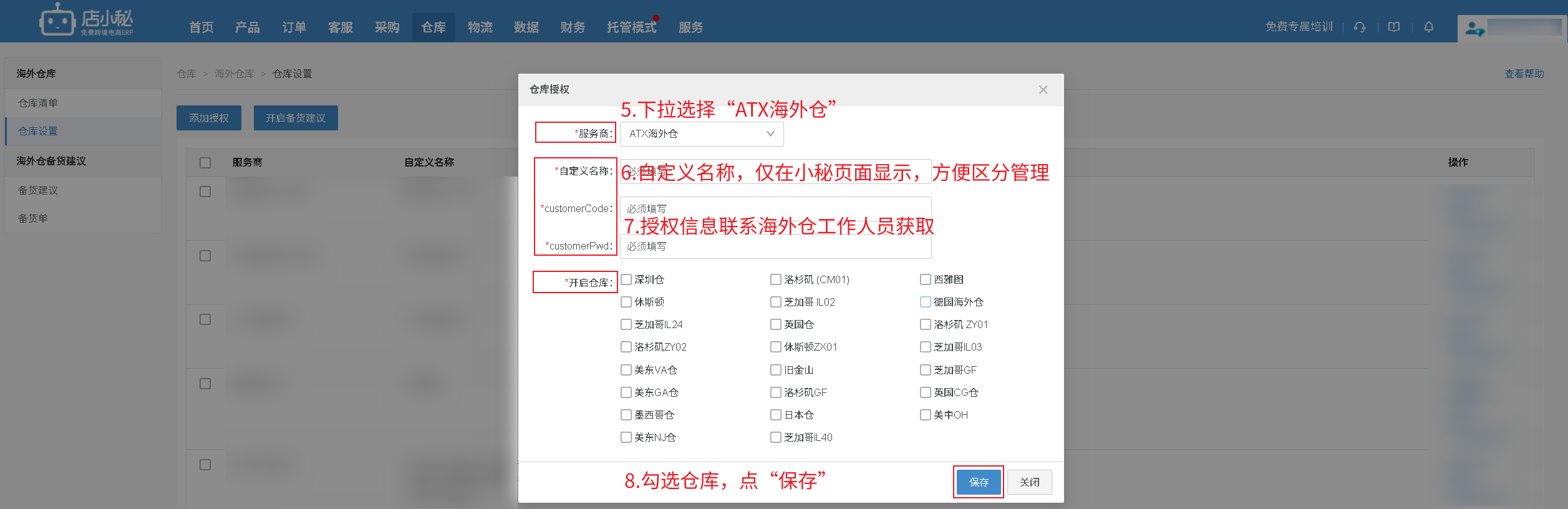 【仓库—海外仓库—仓库设置—添加授权—选择“ATX海外仓”—自定义名称—联系海外仓工作人员获取—勾选仓库—保存即可】