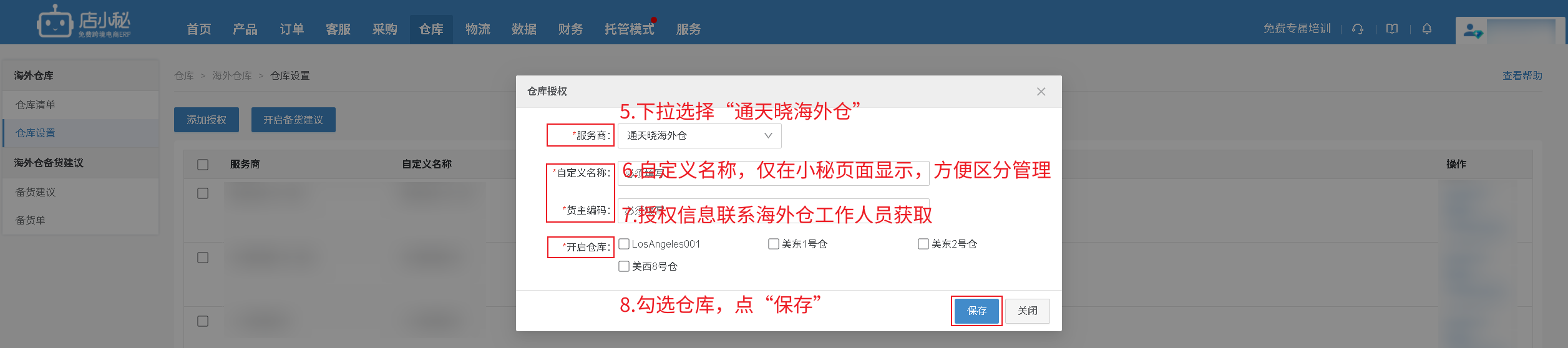 ”—自定义名称—联系海外仓工作人员获取—勾选仓库—保存即可】