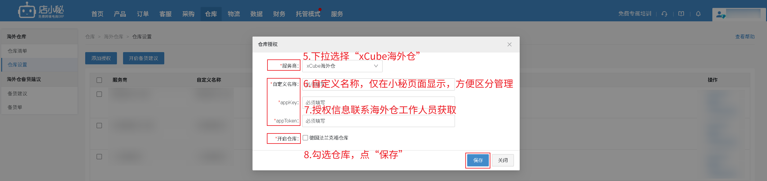 【仓库—海外仓库—仓库设置—添加授权—选择“xCube海外仓