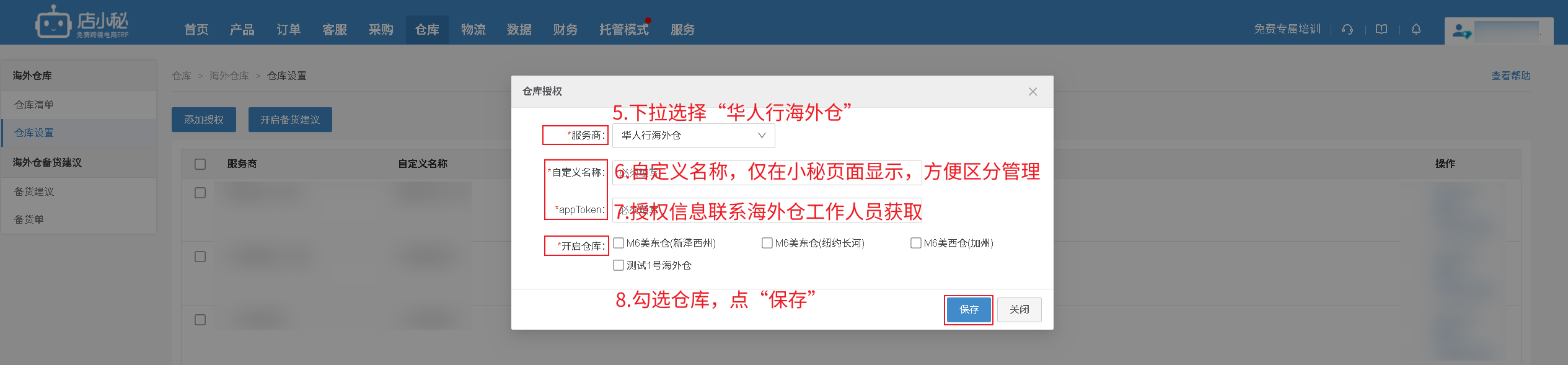 【仓库—海外仓库—仓库设置—添加授权—选择“华人行海外仓”—自定义名称—联系海外仓工作人员获取—勾选仓库—保存即可】