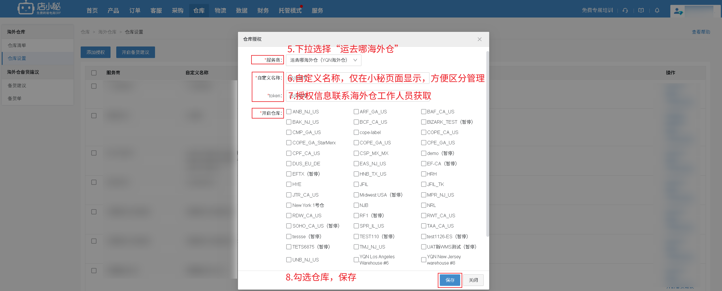 ”—自定义名称—联系海外仓工作人员获取—勾选仓库—保存即可】