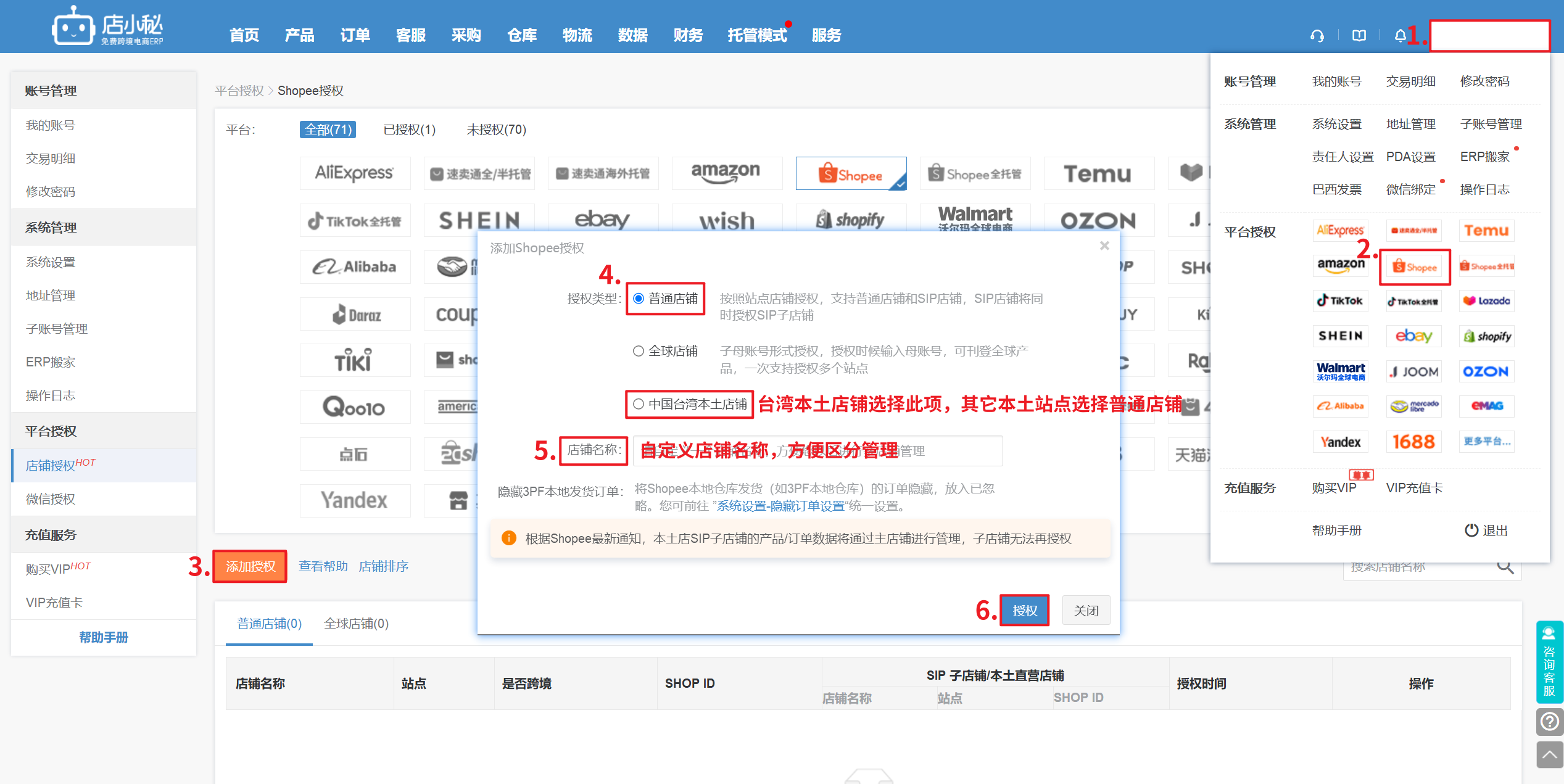 第一步:【登录店小秘主账号—用户名—平台授权—点击“Shopee”—点击添加授权—选择“普通店铺”—自定义店铺名称—授权】
