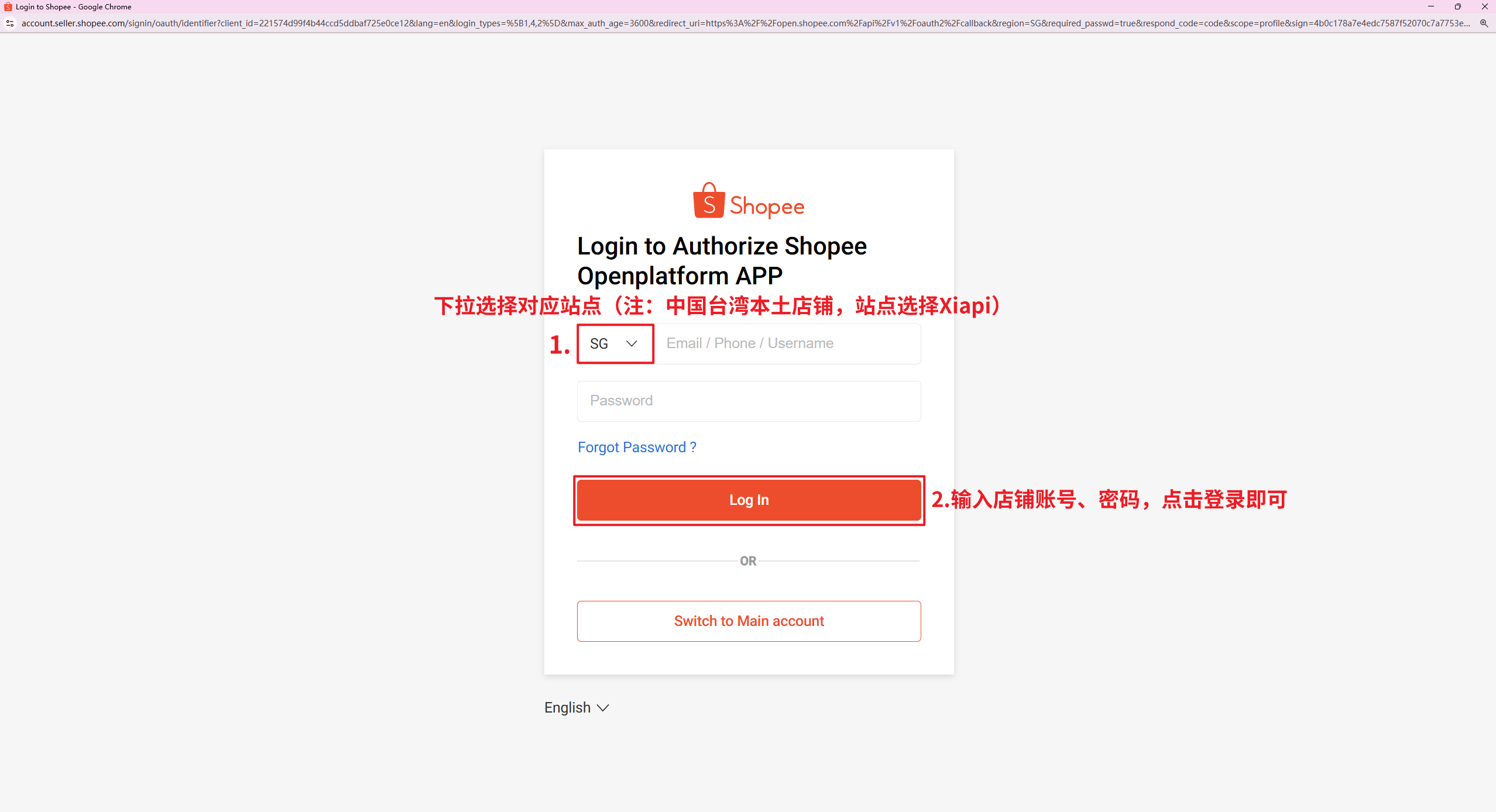 注意:如果您当前已经有登录Shopee后台,页面会直接显示您的Shopee账号,不要直接点击登录完成授权