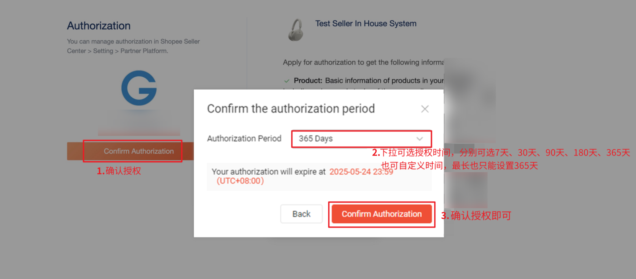 第三步:【点击确认授权,选择授权时间再确认,提示 Authorization success ,跳转小秘页面】